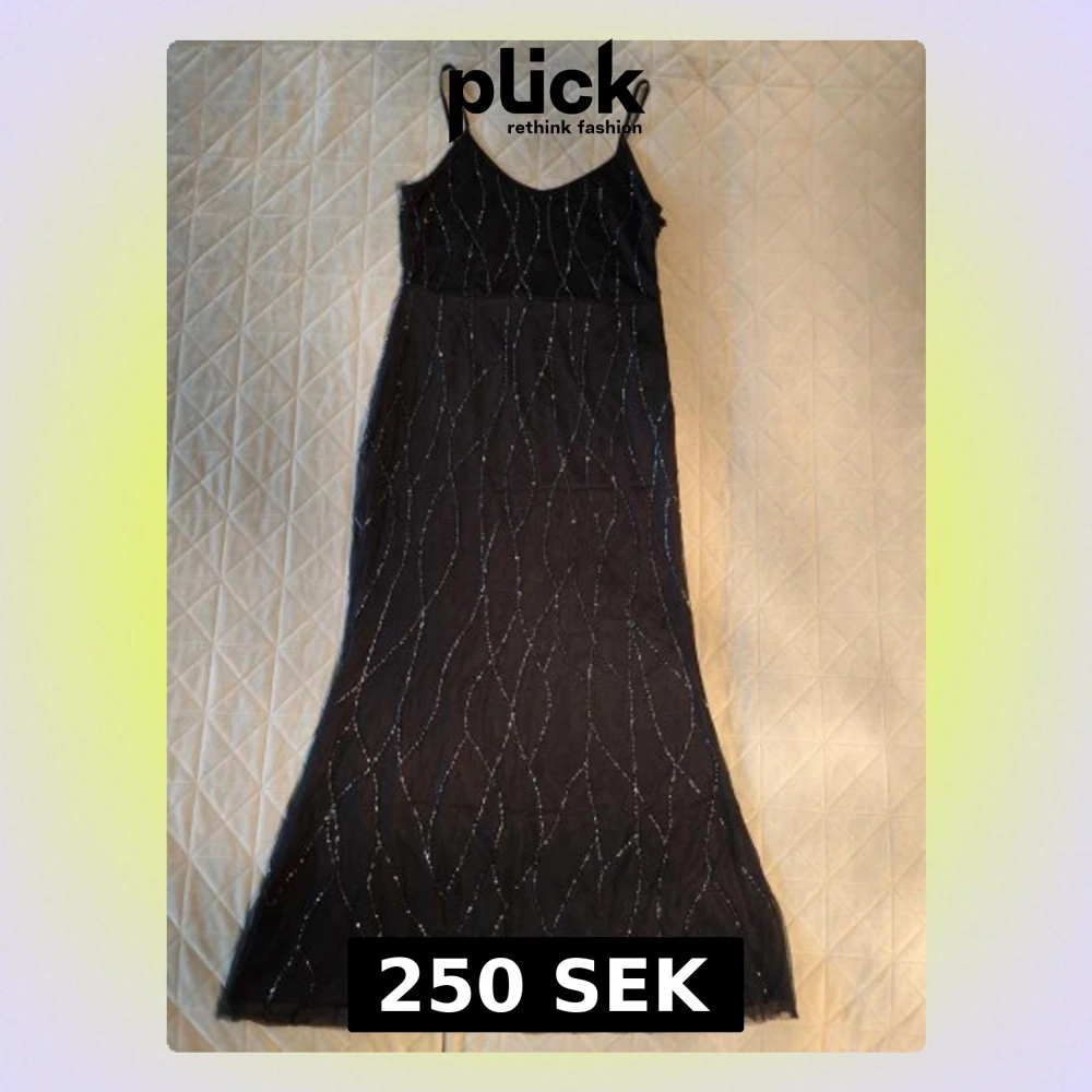 Svart långklänning med tunna axelband och glittriga pärldetaljer i vågiga mönster över hela klänningen. Klänningen är ca 135 cm lång och har en lätt utsvängd form nedtill. Materialet är tunt och ger ett elegant intryck, perfekt för att sticka ut.