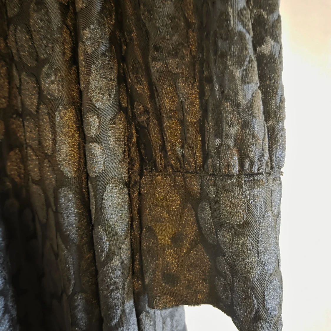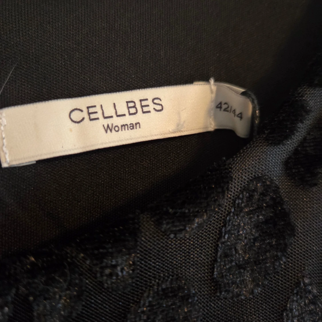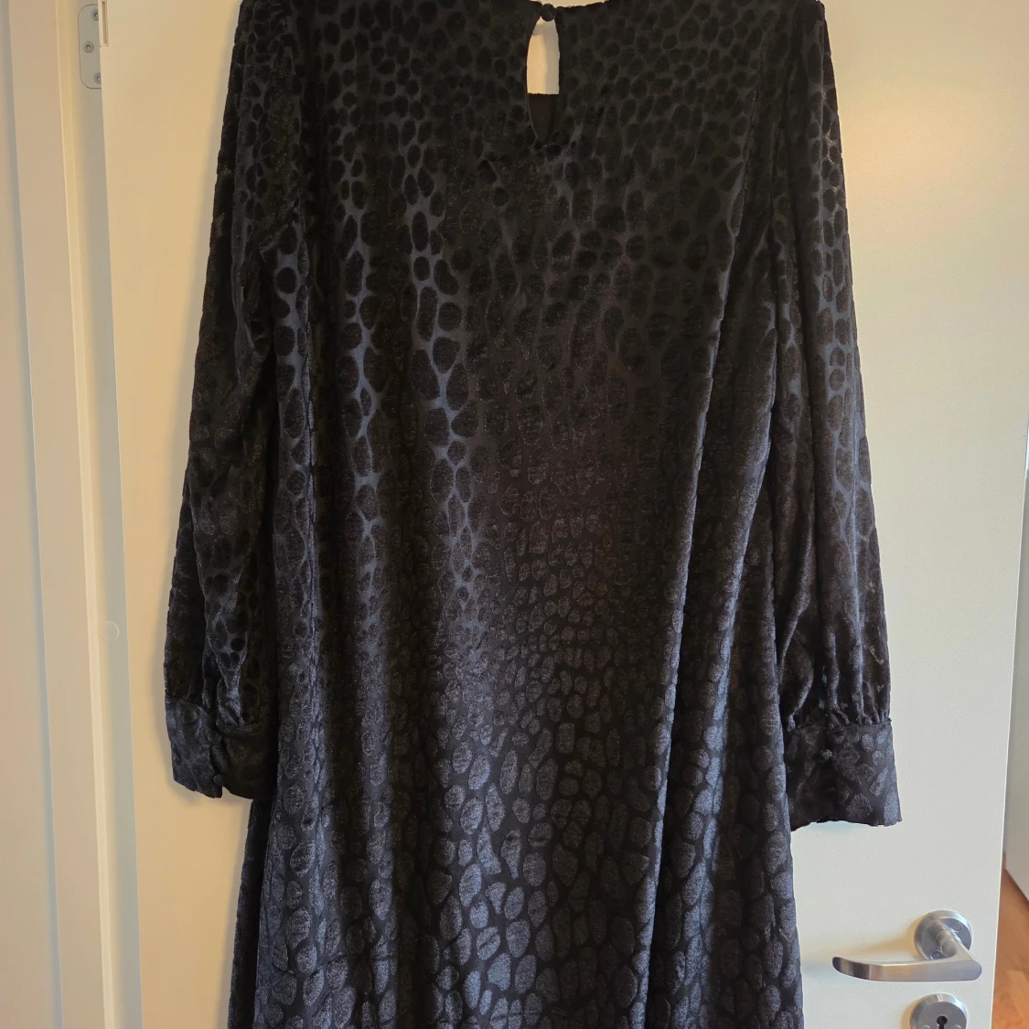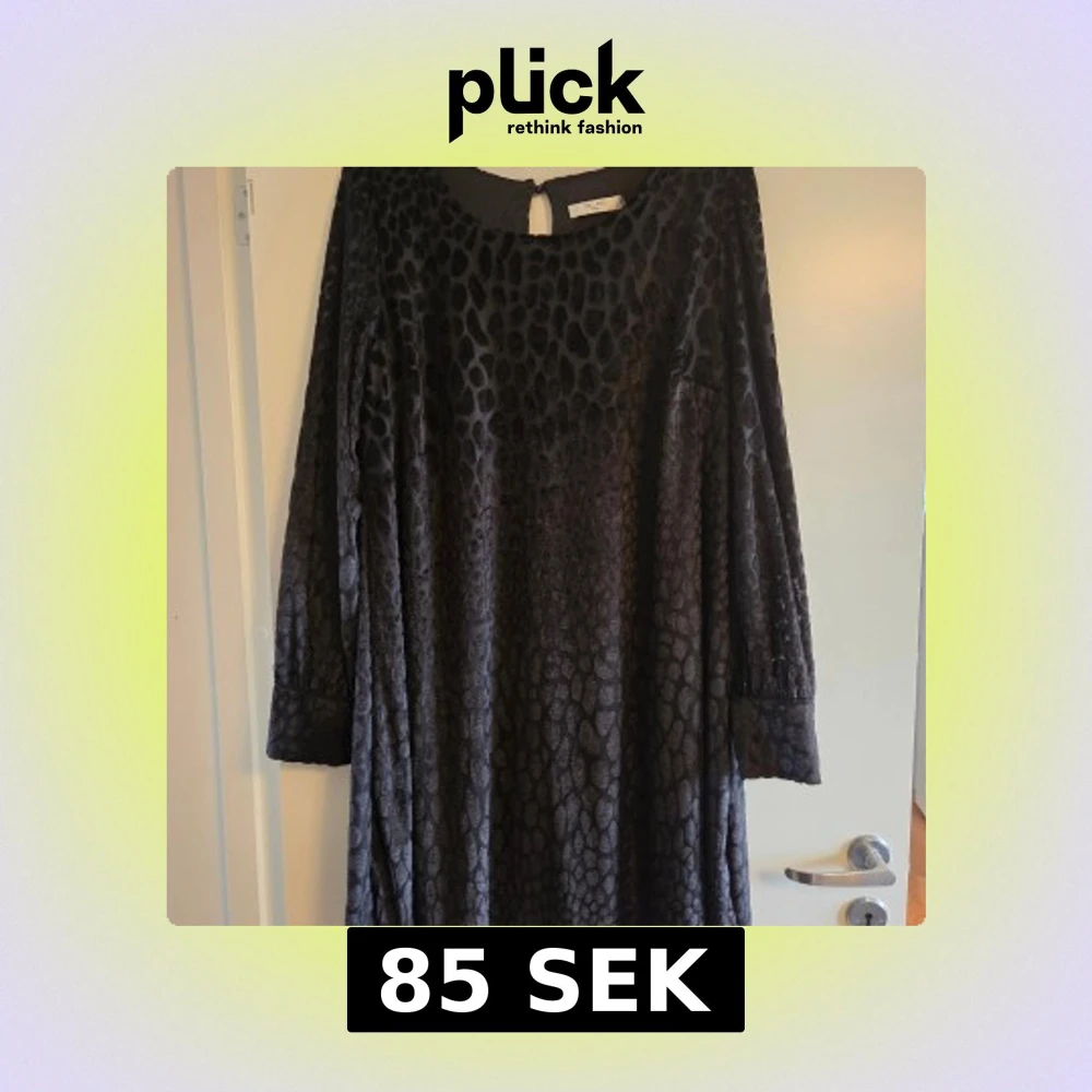 Cool svart klänning / tunika från Cellbes med glansigt mönster. Klänningen har långa ärmar med breda muddar och är tillverkad i mjuk polyester. Rund halsringning med knapp i nacken ger en snygg detalj. Perfekt för dig som gillar djurmönstrat och vill sticka ut. Nyskick, aldrig använd.
