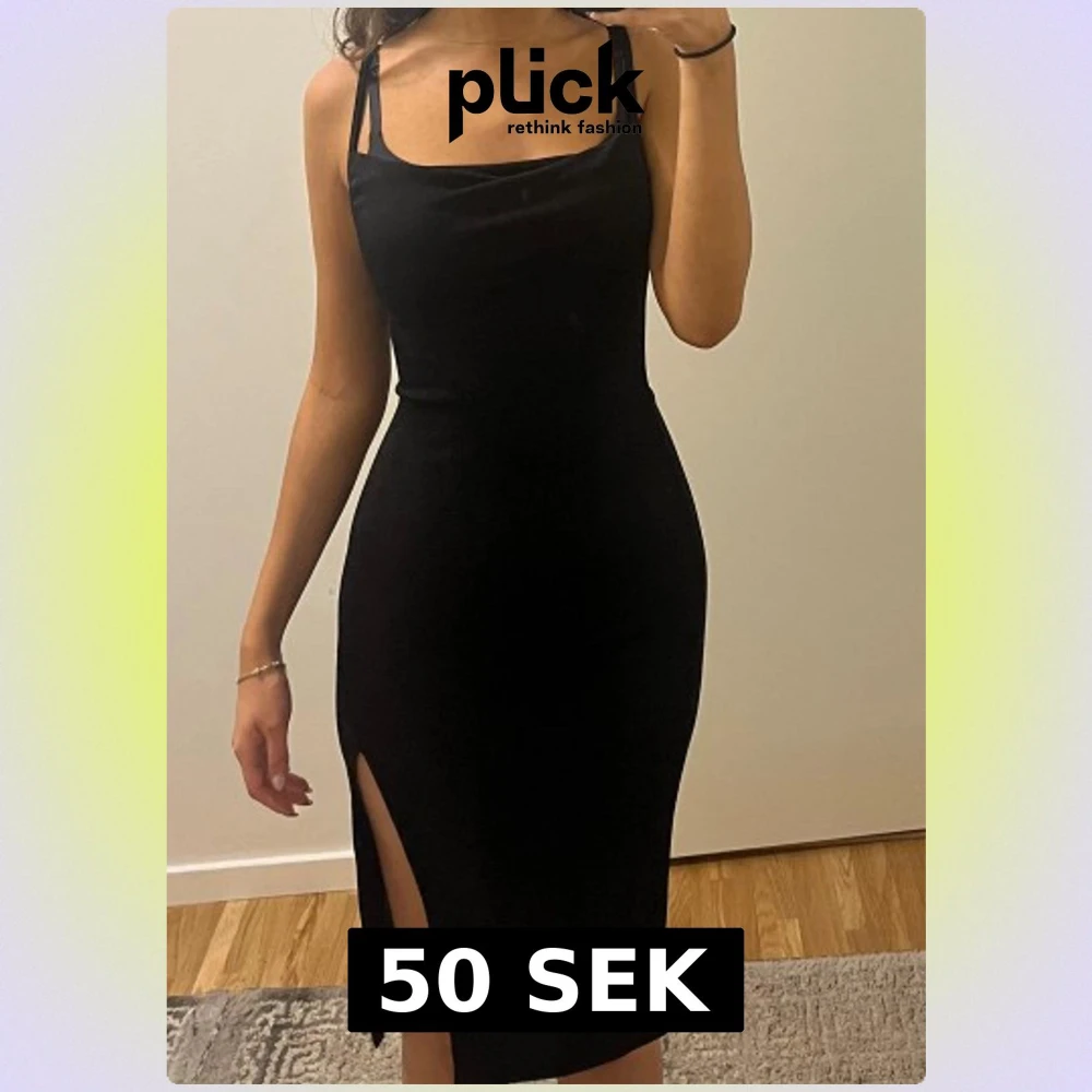 Snygg svart midi klänning med smala axelband och en stilren, rak siluett. Klänningen har en elegant slits på ena sidan och en lätt draperad urringning.