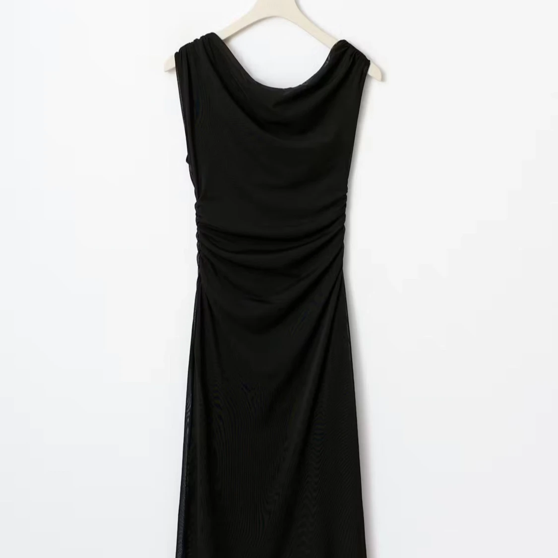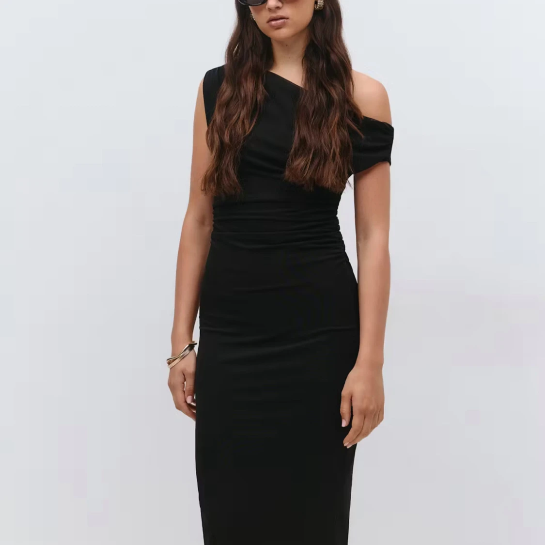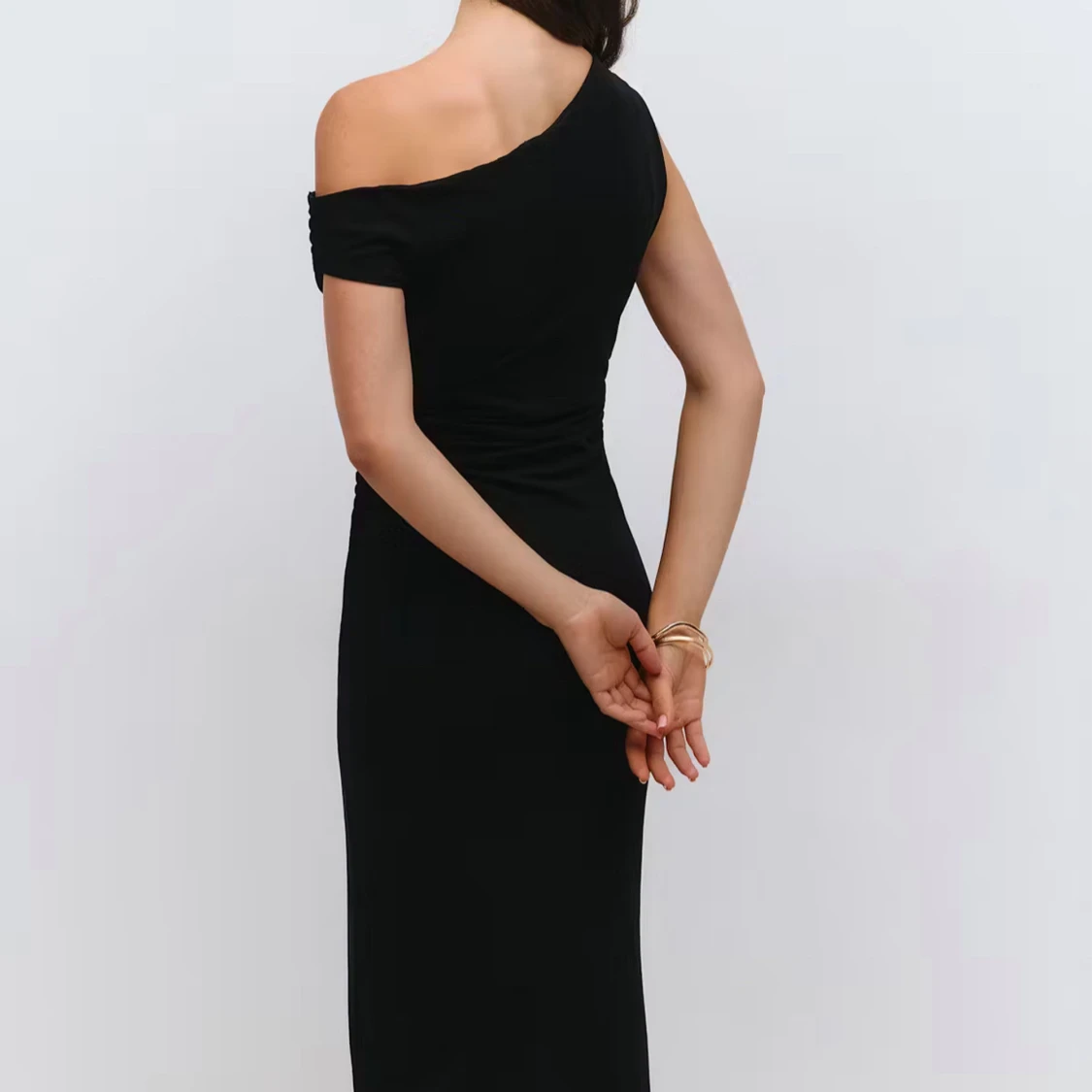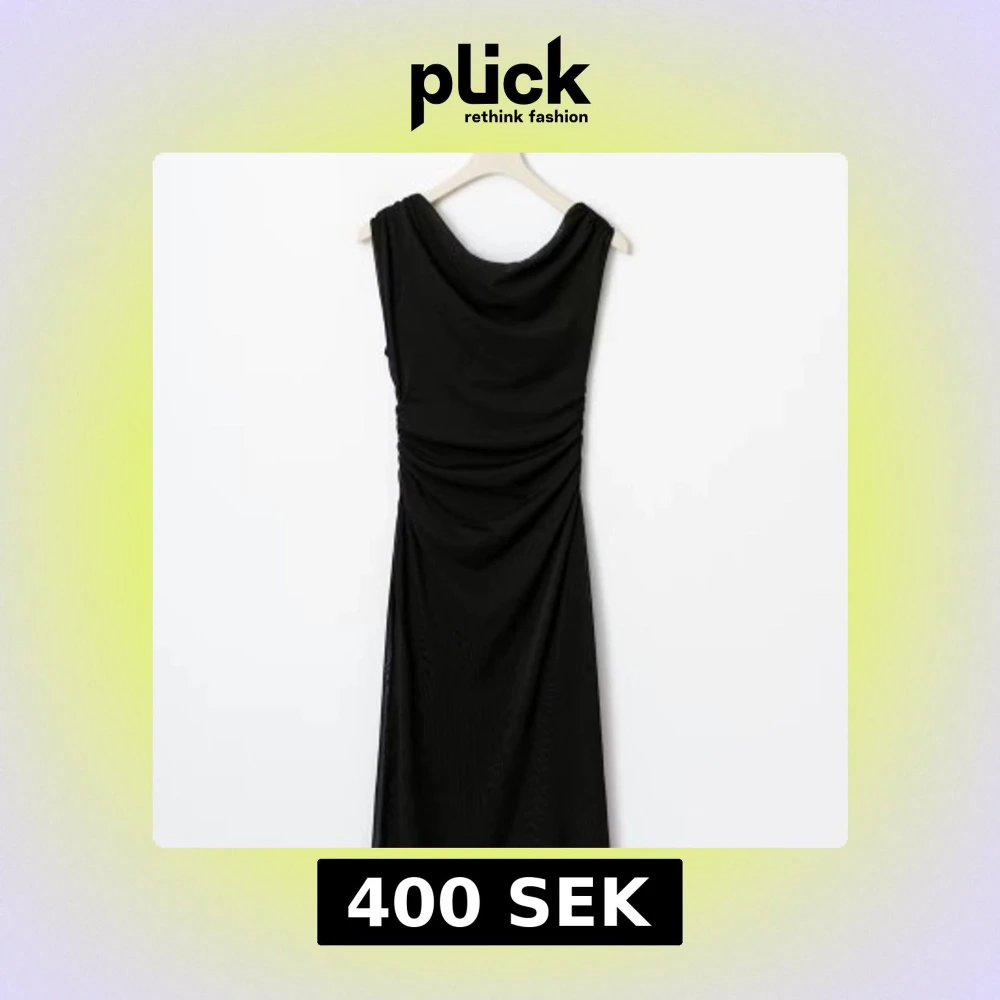 Säljer en svart långklänning med oneshoulder-design och draperad effekt i midjan. Använd en gång! Nu pris 500kr