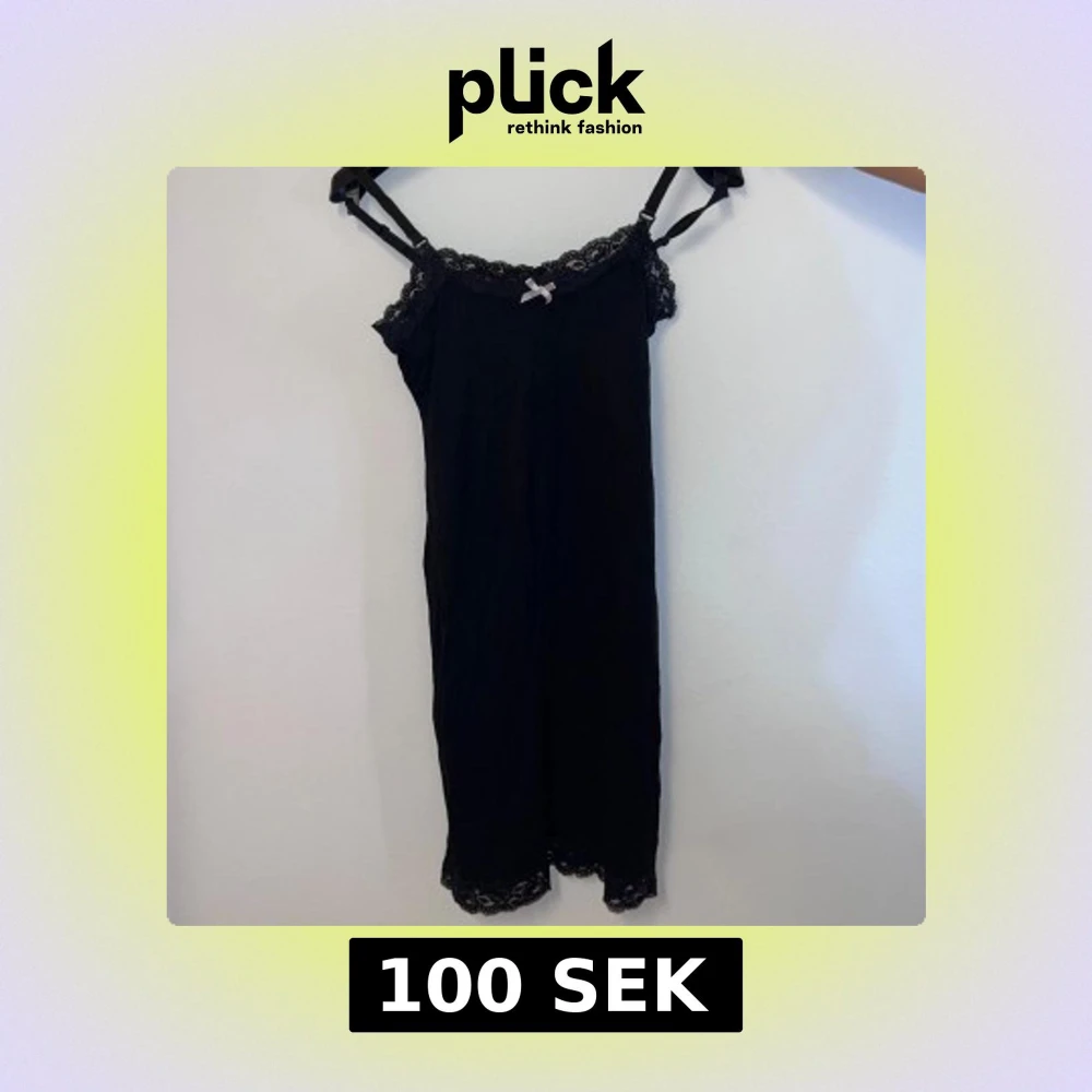 Elegant svart pyjamasklänning med spetsdetaljer vid halsringningen och nederkanten. Klänningen har smala axelband och en söt liten rosett framtill. Perfekt för en stilren look.