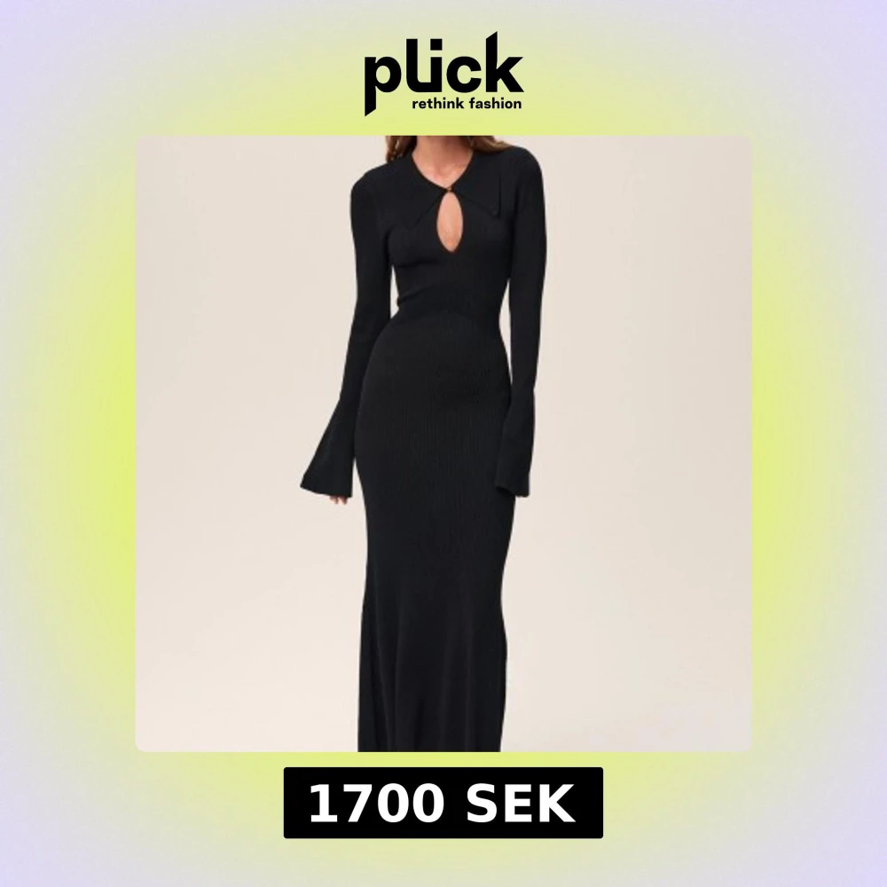 Elegant svart ribbad långklänning med långärmad design och en stilren nyckelhålsdetalj framtill. Perfekt för en sofistikerad look. Prislappen kvar, endast testad.
