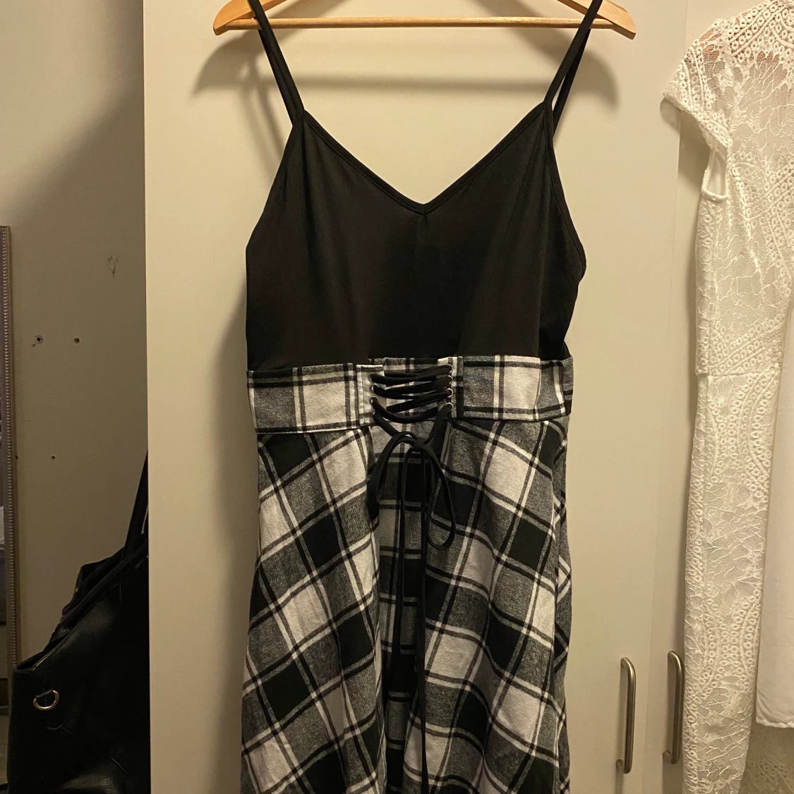 Svart, vit rutig klänning med knytning i fram. Stl. L men är justerbar så passar de med M också. Oanvänd, ny skick Ny skick