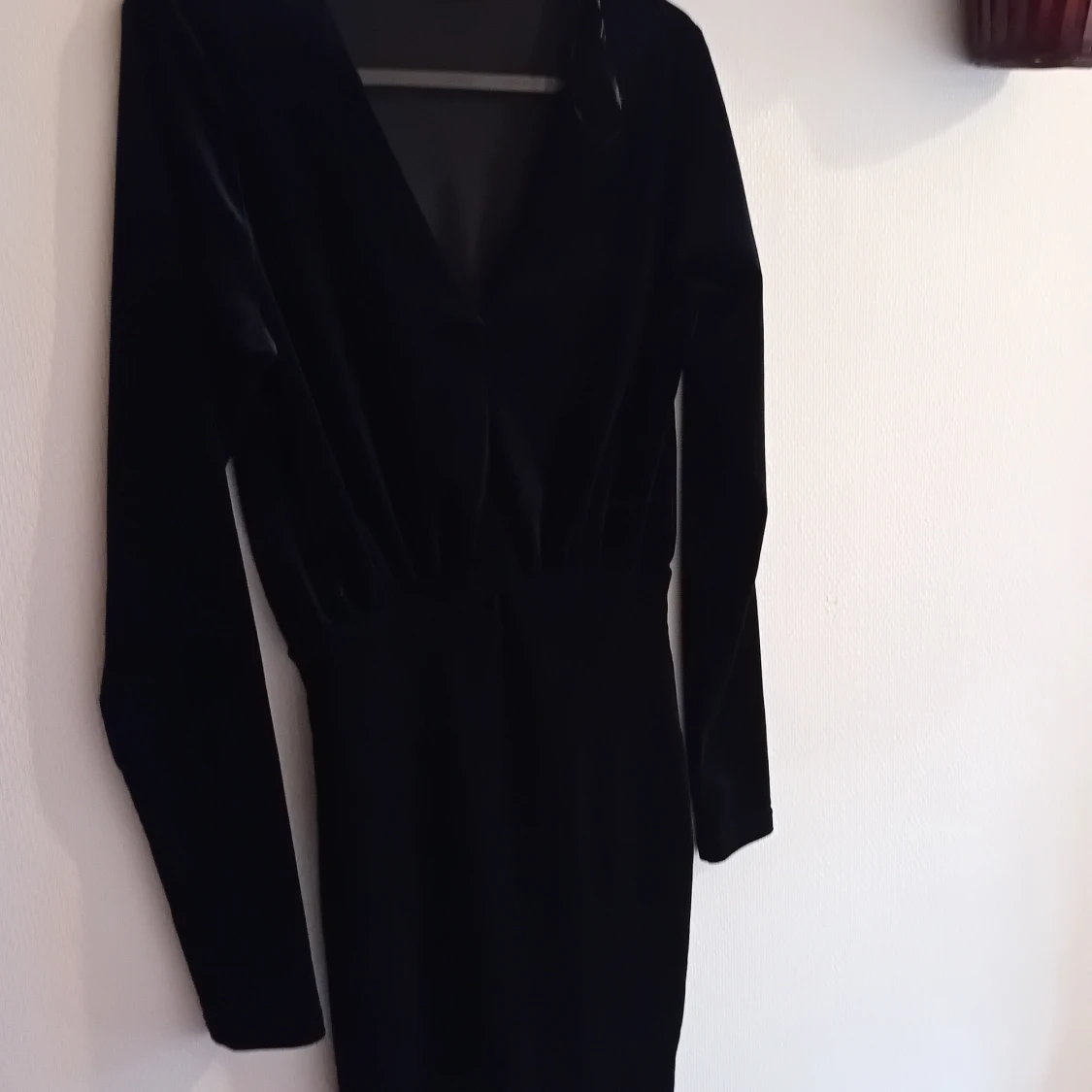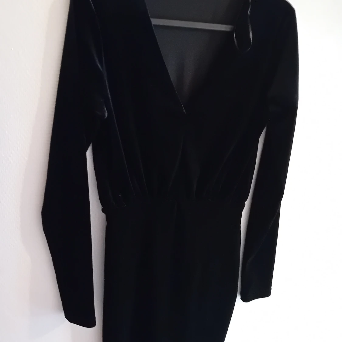 Snygg svart klänning i sammet med långärmad design och v-ringning. Perfekt för en elegant kväll eller fest. Klänningen har en tight passform som framhäver figuren.