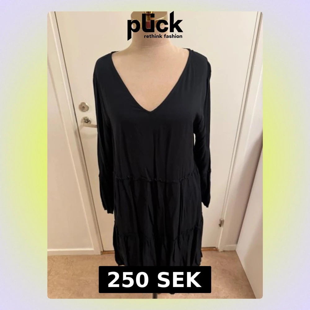Svart klänning från Jacqueline de Yong i storlek 40. Modellen har v-ringning, långa ärmar och flera volanglager som ger en flowy känsla. Klänningen är kort och har en avslappnad passform, perfekt för dig som gillar en enkel men snygg stil.
