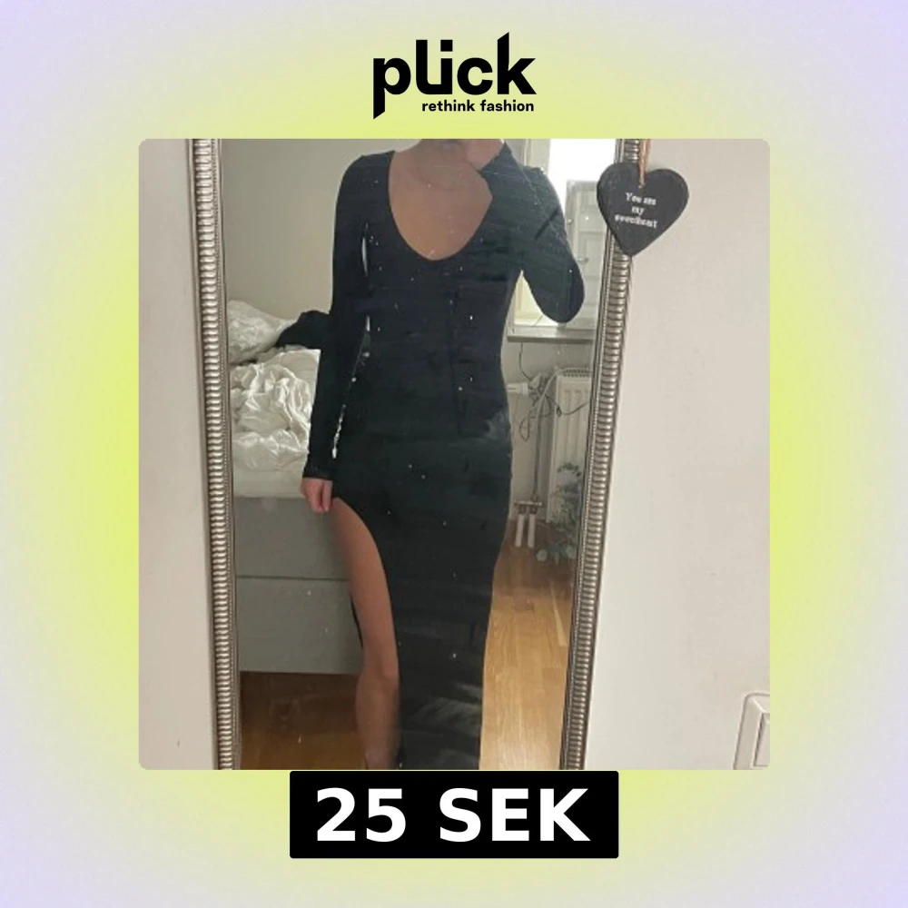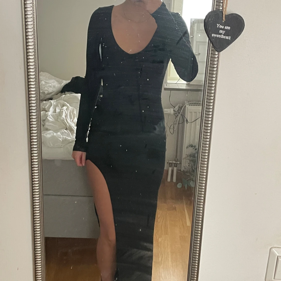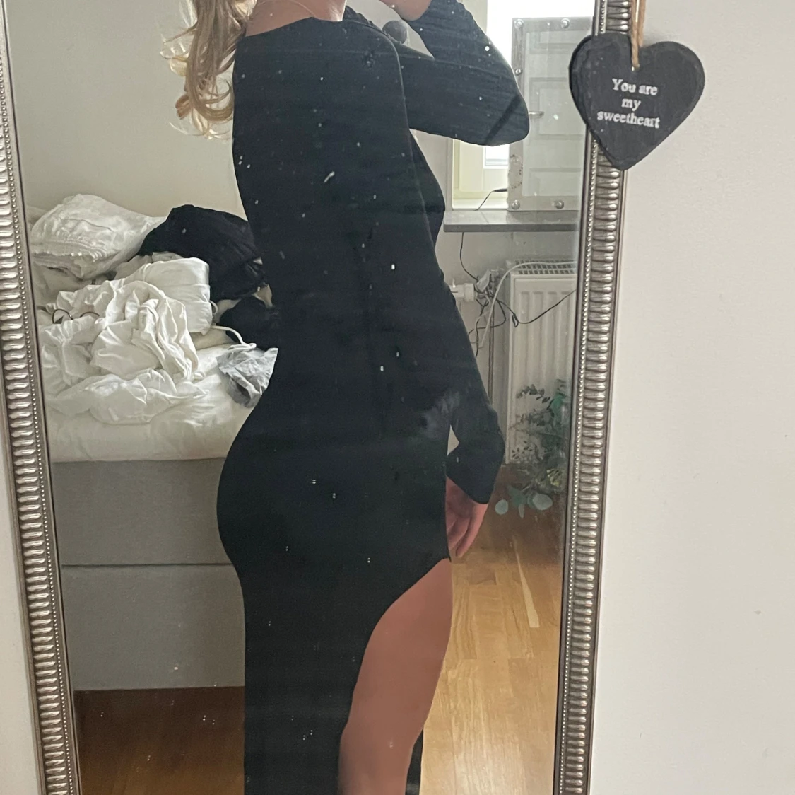 Säljer denna svarta långklänning med ett superskönt material, den har en fin slits på sidan och sitter perfekt på kroppen. Klänningen formar kroppen och har ett strechigt material
