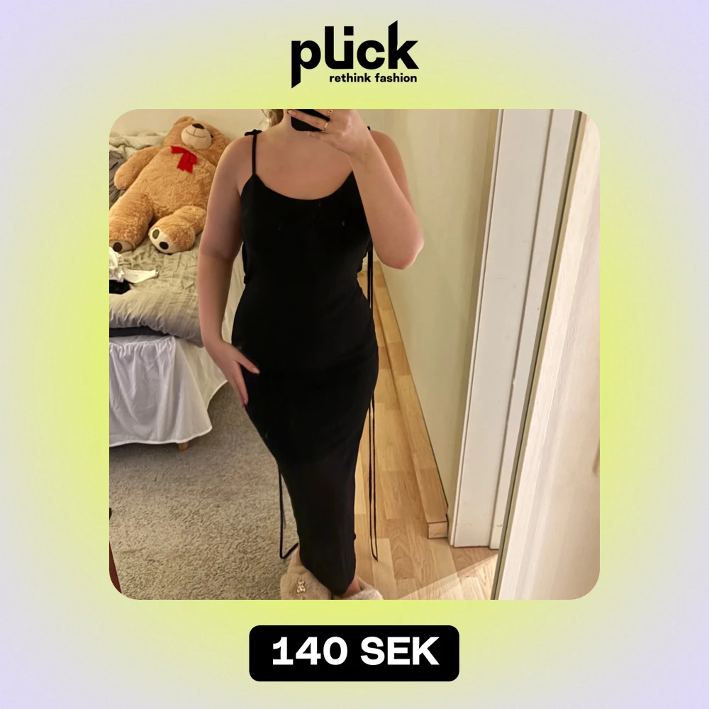 Snygg svart klänning med glittrigt material och smala axelband som man själv kan knyta. Den har en tight passform och en elegant öppen rygg. Perfekt för en kväll ute! Super snygg😍