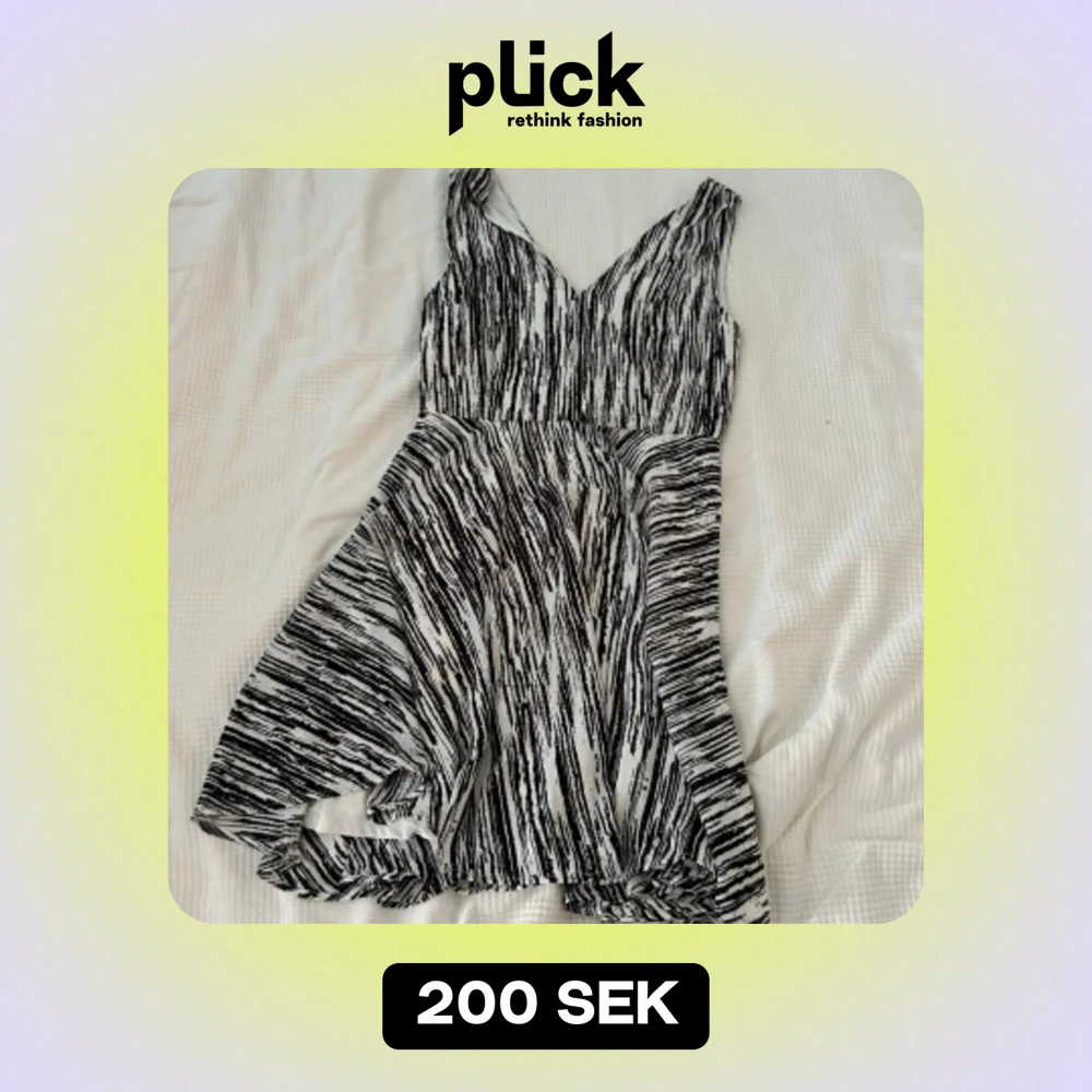 Säljer en superfin svartvit klänning, den har ett coolt randigt mönster och en v-ringad design.