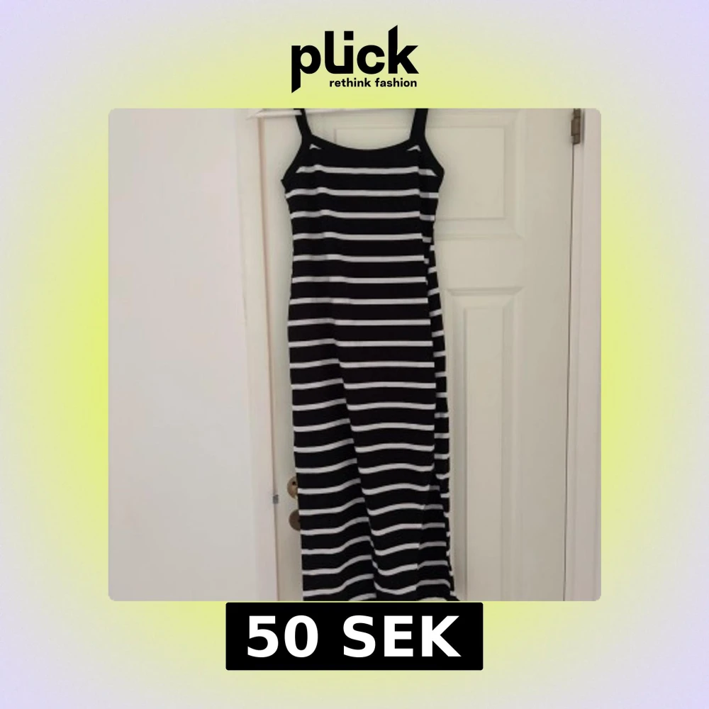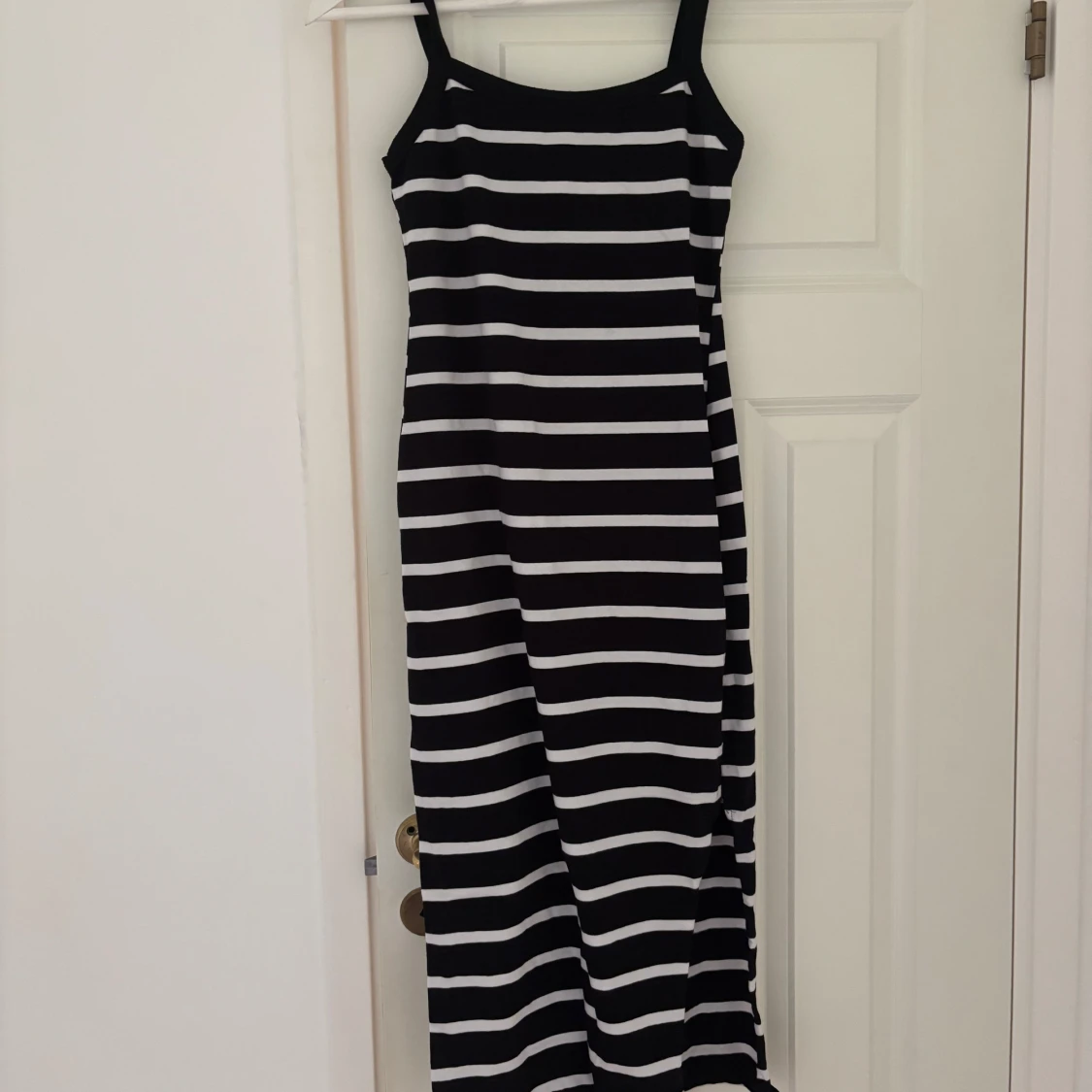 Säljer en svartvit långklänning med smala axelband och horisontella ränder. Klänningen har en rak och enkel siluett som ger en chill vibe. Perfekt för dig som gillar klassiska mönster och vill ha något bekvämt och snyggt.