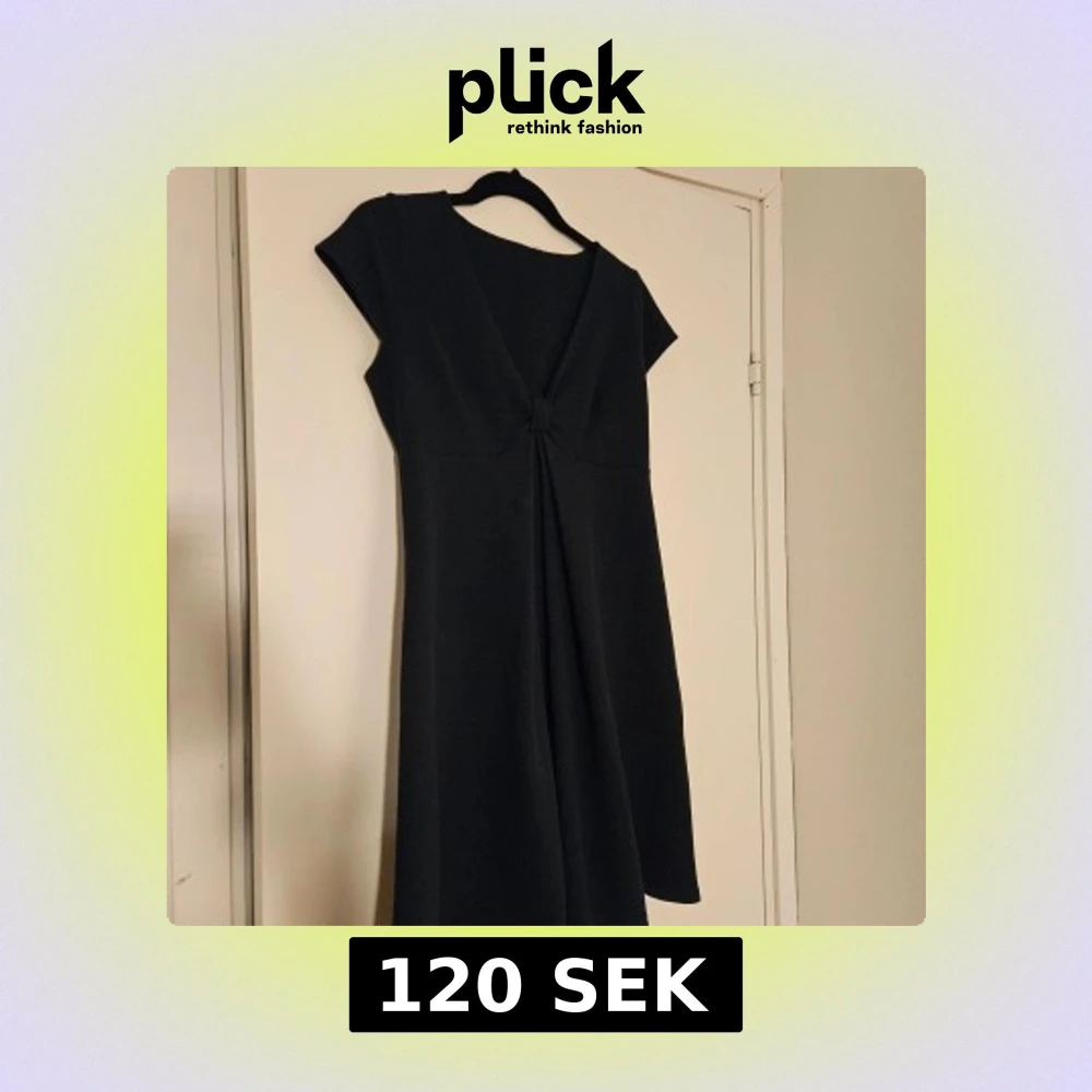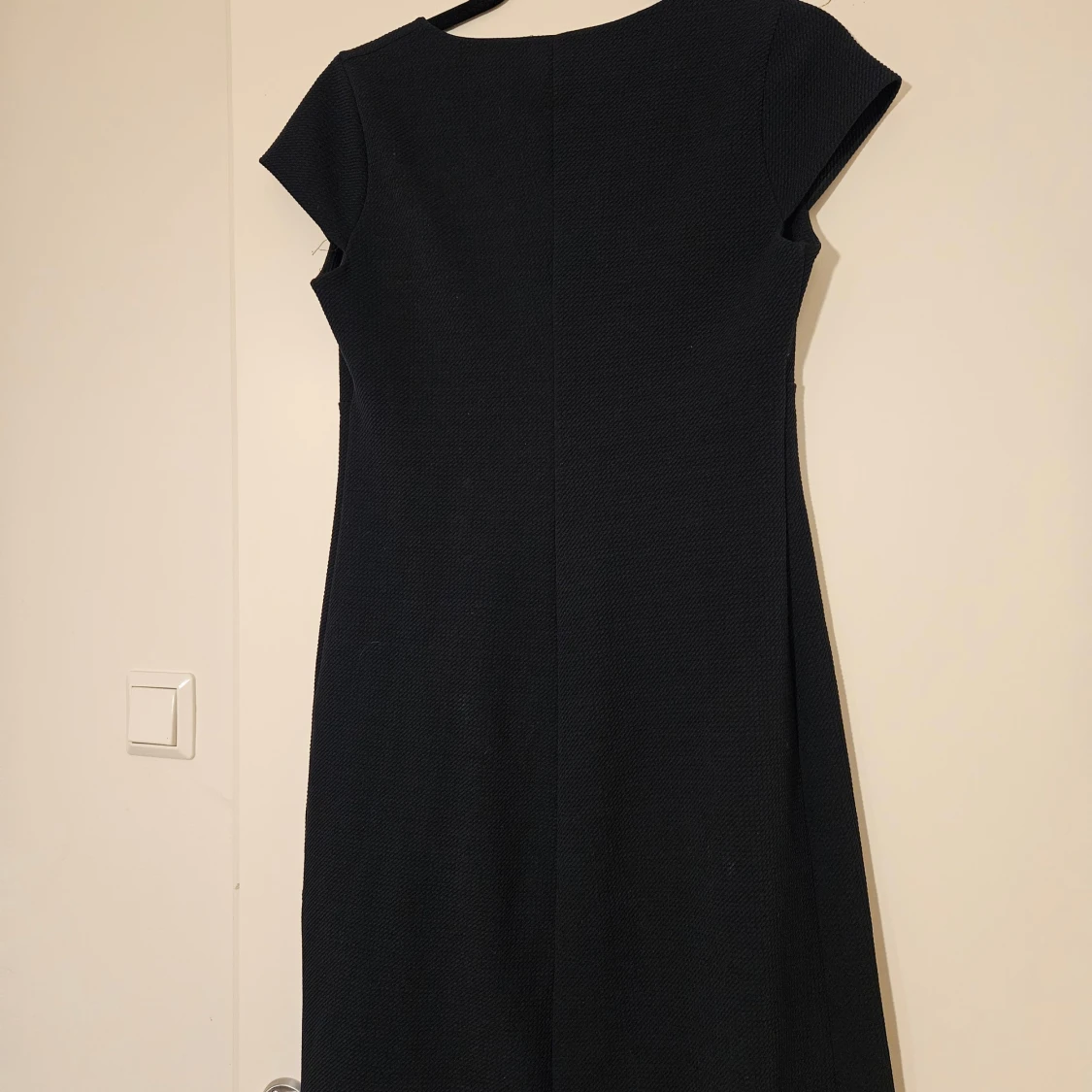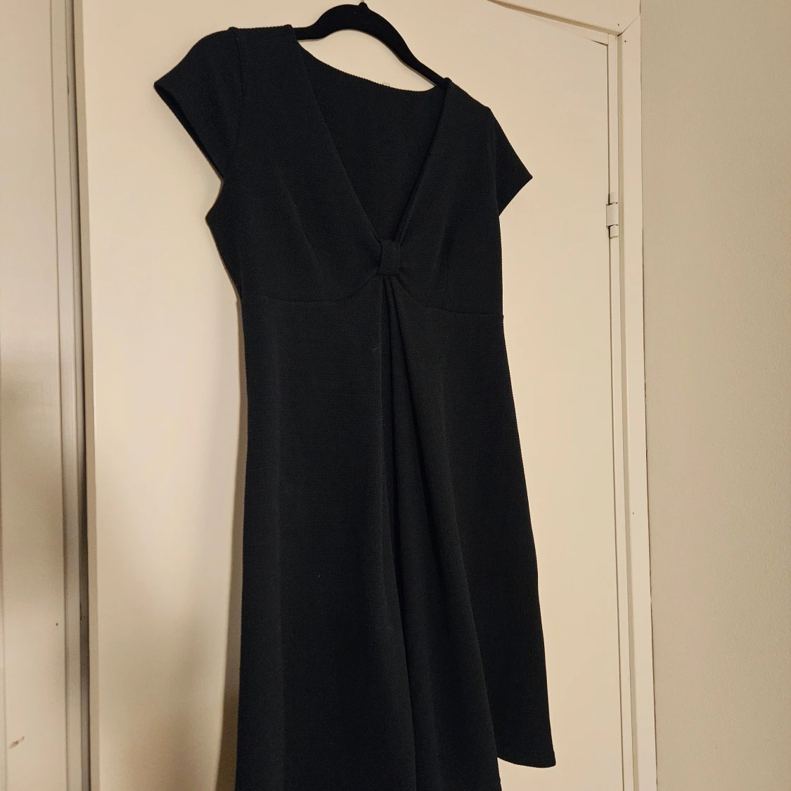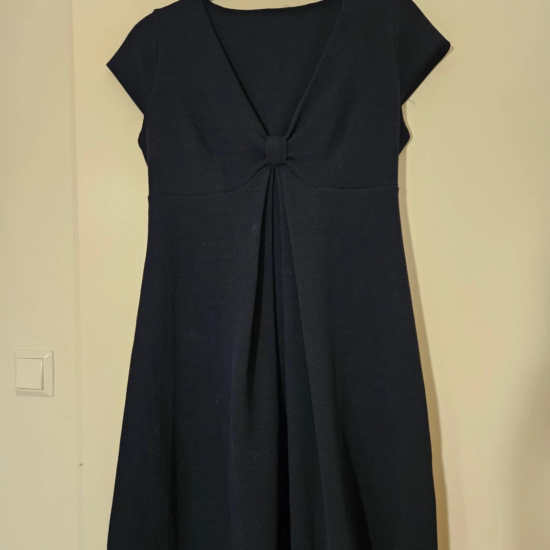 Marinblå kortärmad klänning från Egerie med v-ringning och snygg knutdetalj framtill. Tillverkad i Frankrike. Klänningen har en lätt utställd form och är tillverkad i mjukt, stretchigt material med struktur. Säljer då den tyvärr är för stor för mig. Storlek T3, vilket motsvarar L