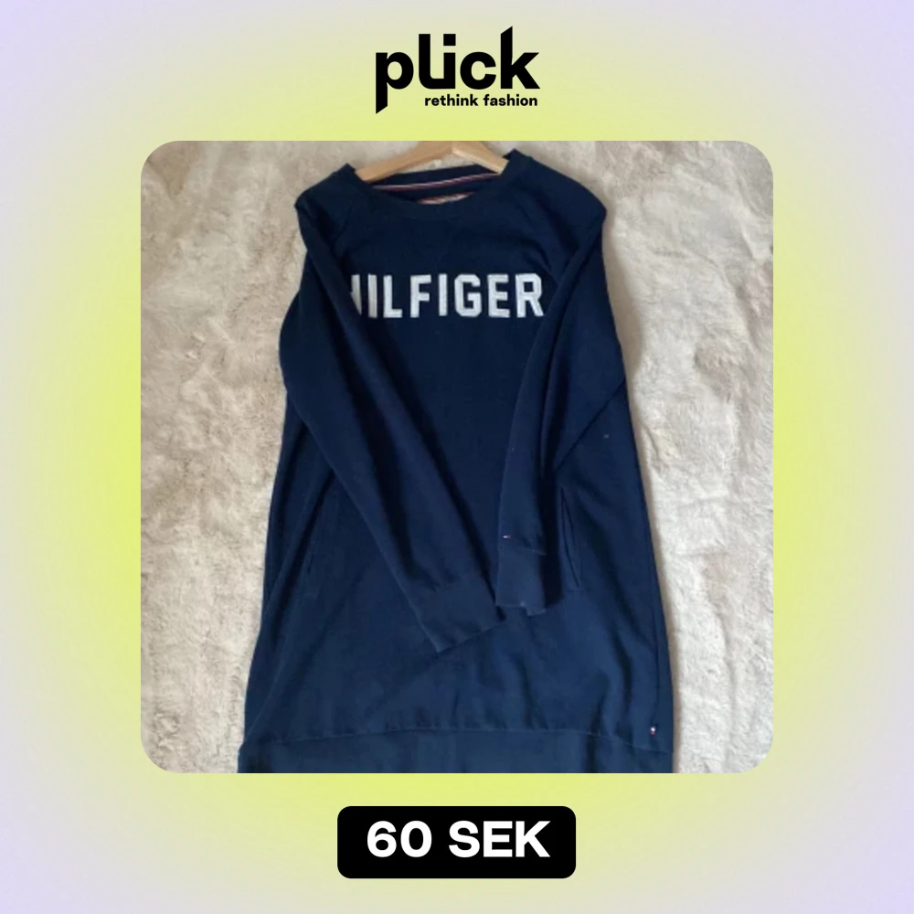 Fin blå klänning i storlek M med fickor framtil och stor text på klänningen
