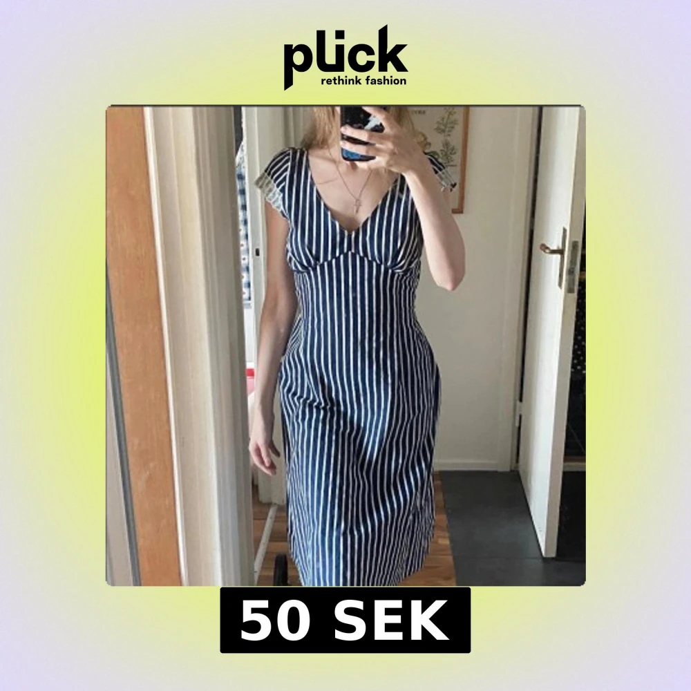 Superfin klänning med marinblå och vita vertikala ränder, v-ringad framtill och korta ärmar med spetskant. Midjeband som knyts i ryggen och figurnära passform upptill. Perfekt för dig som gillar en klassisk men söt look.