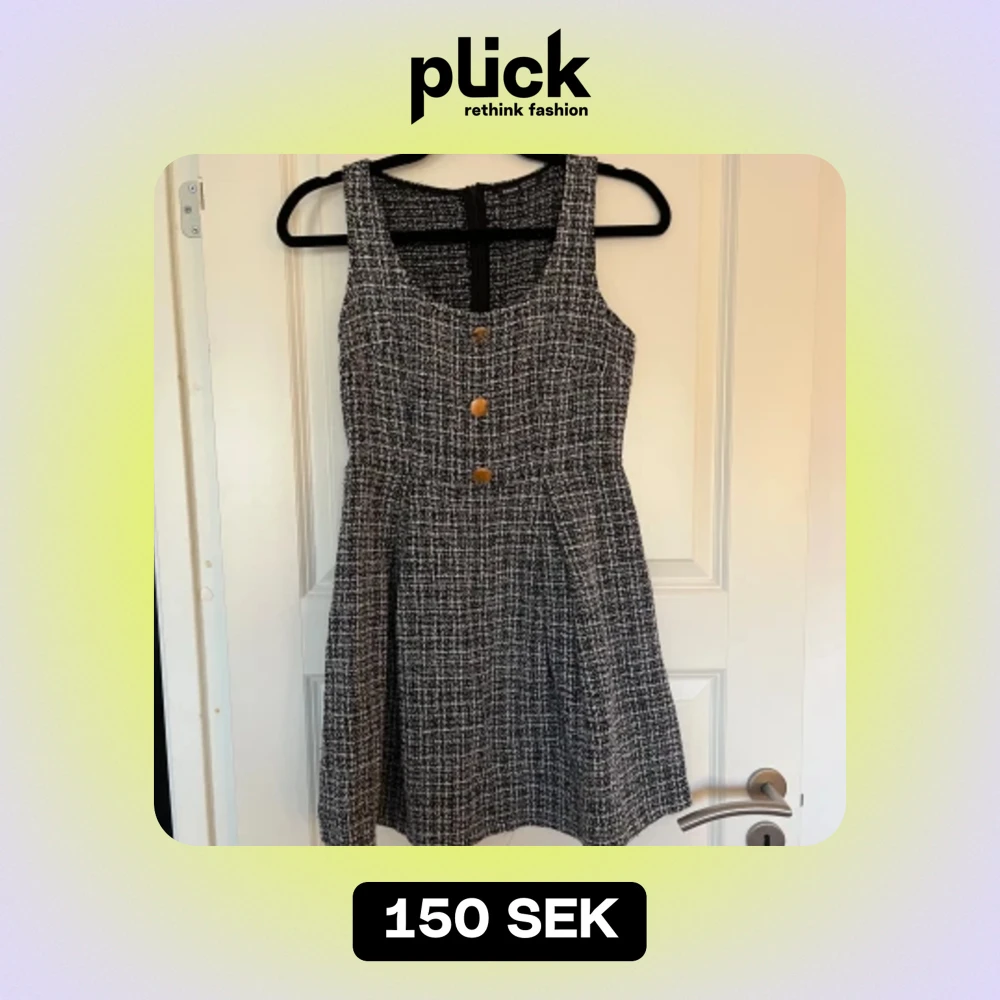 Tweed klänning med guldknappar, aldrig använd. Storlek 34/XS