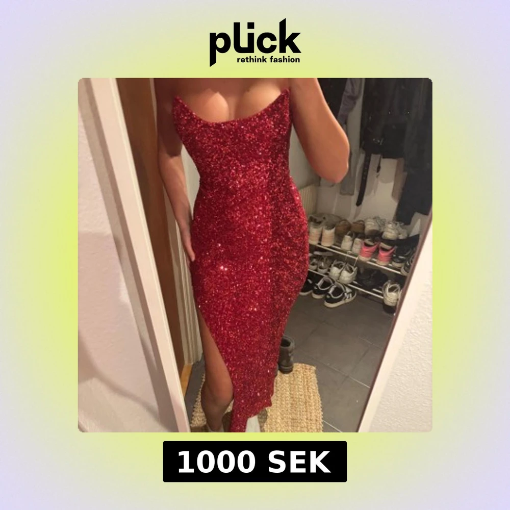 Säljer en röd glittrig långklänning från Oh Polly med figurnära passform, slits på sidan och axelbandslös design. Endast använd 1 gång förra året. ❤️🌹