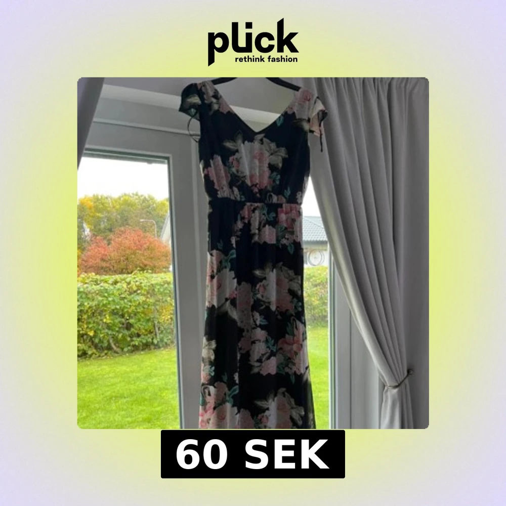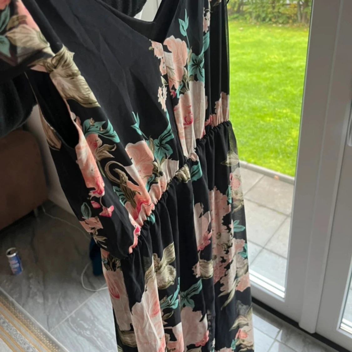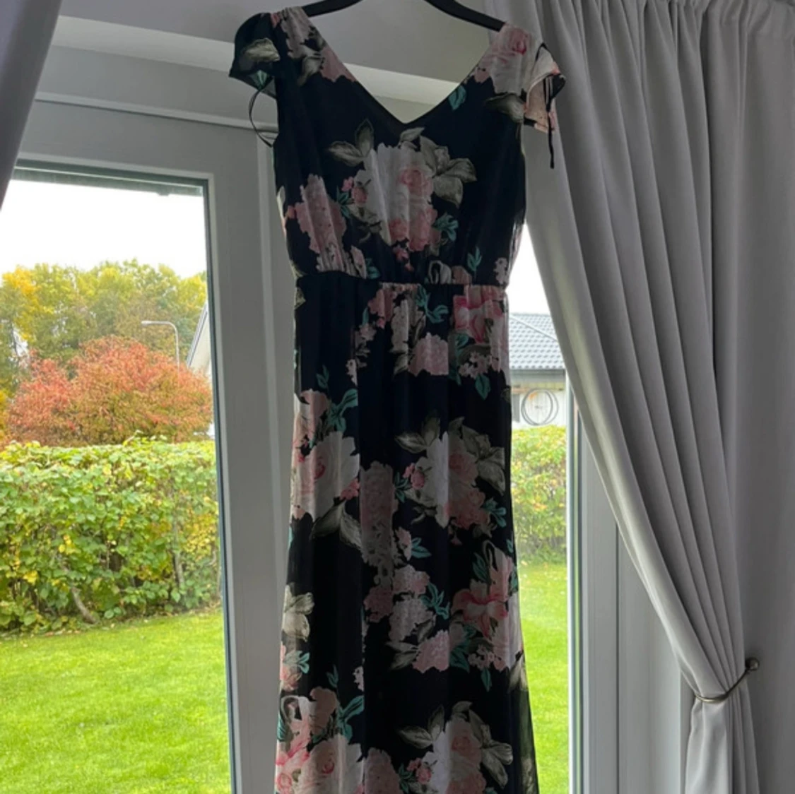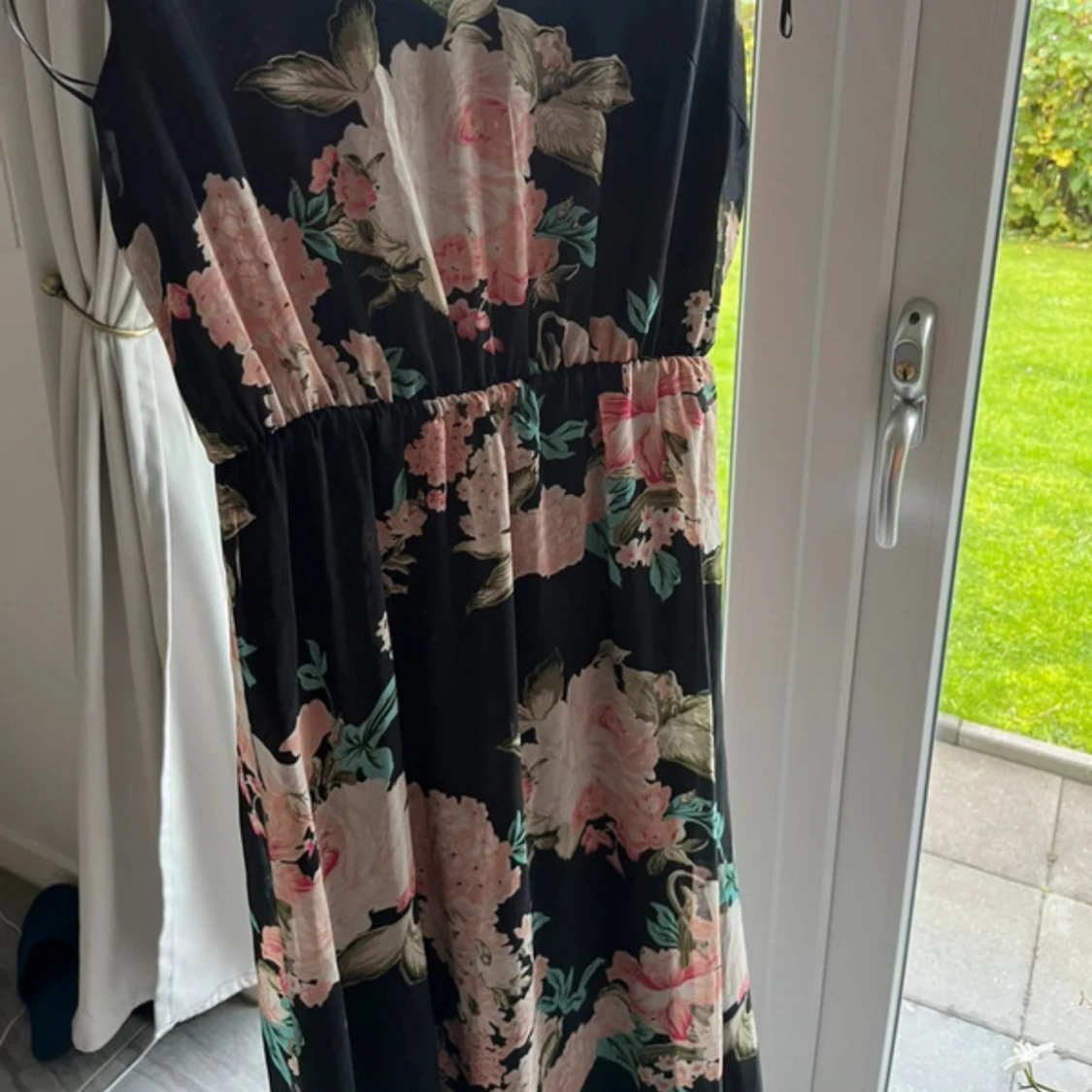 Supersnygg långklänning med svart botten och stora blommor i rosa, beige och grönt. Klänningen har v-ringning, korta ärmar och markerad midja med resår. Perfekt för dig som gillar romantiska vibes och flowy stil.