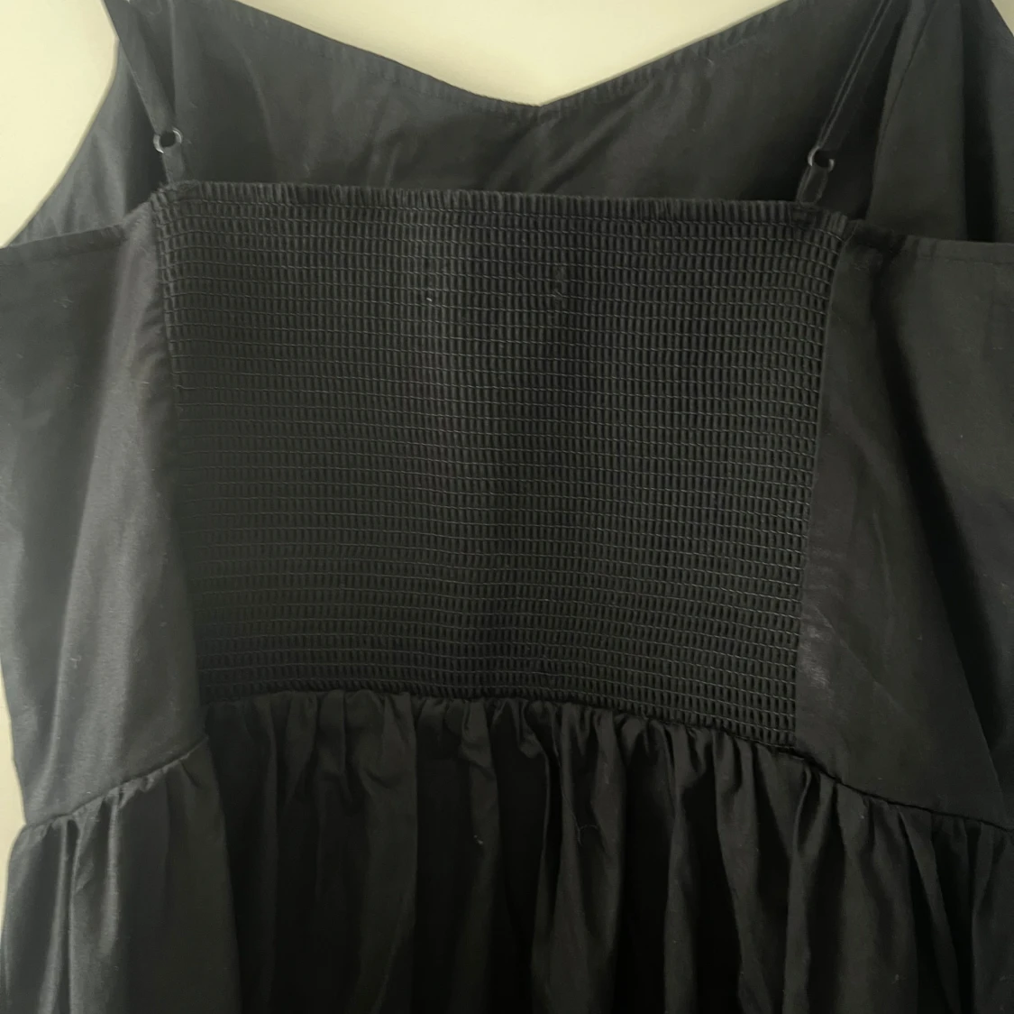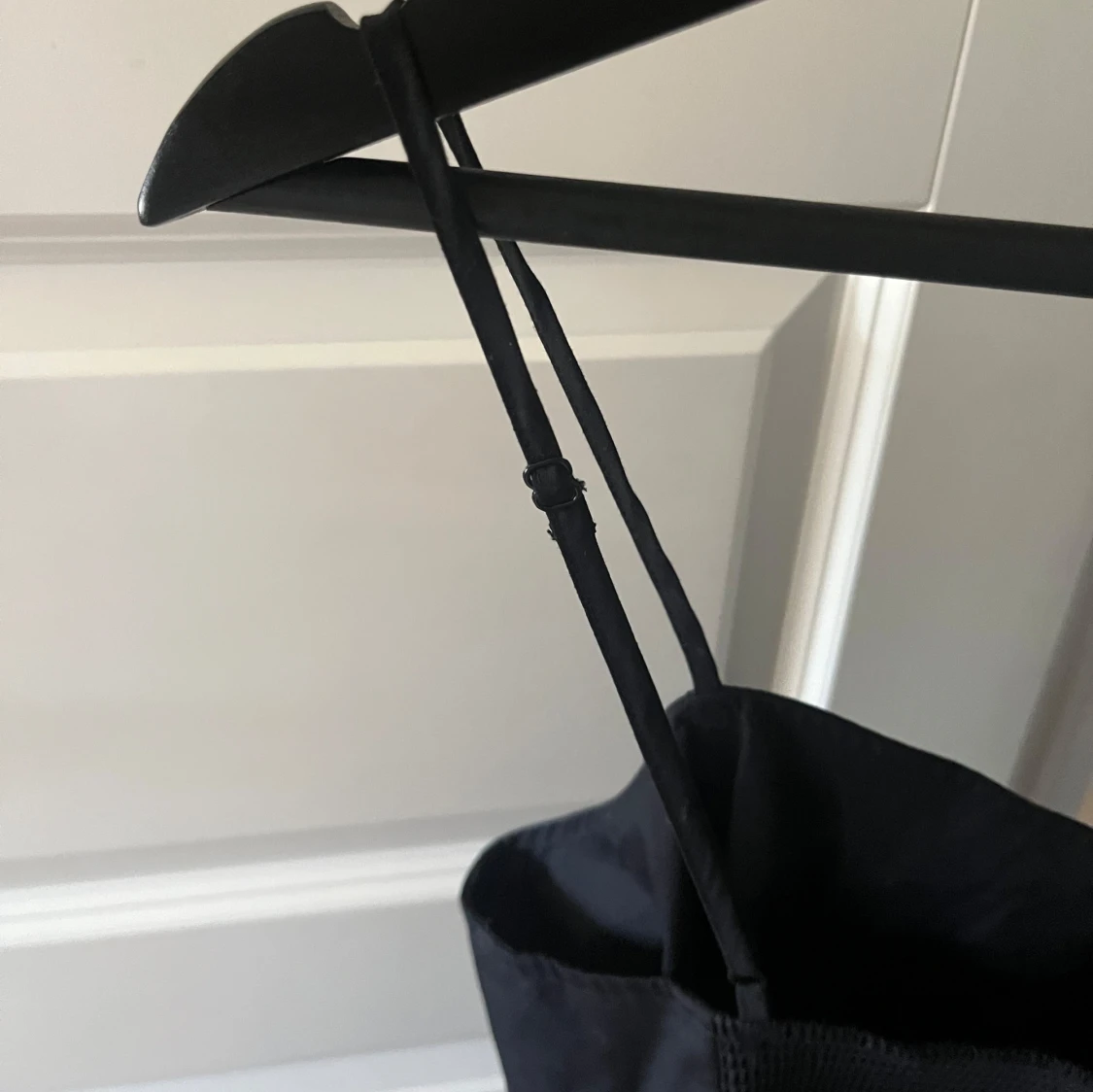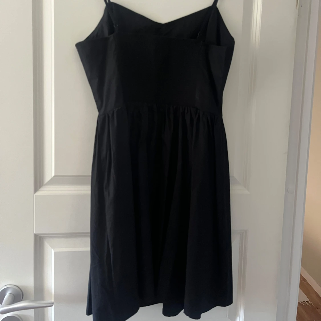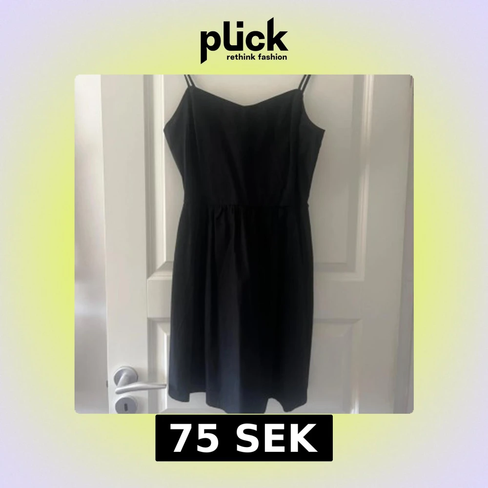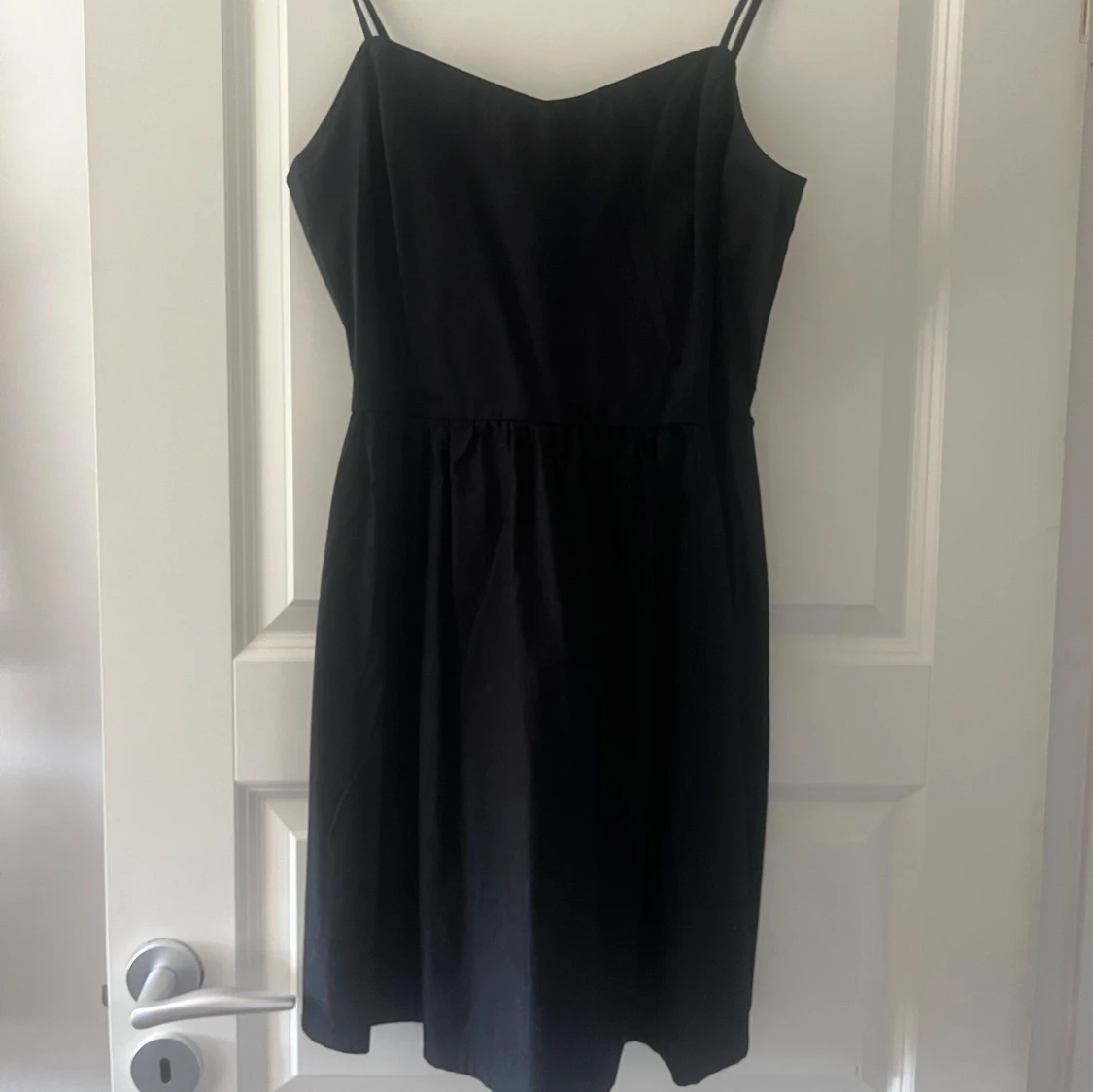 Säljer en elegant svart klänning med smala axelband och rynkad detalj på ryggen. Perfekt för en stilren look. Klänningen har en klassisk design som passar många tillfällen.