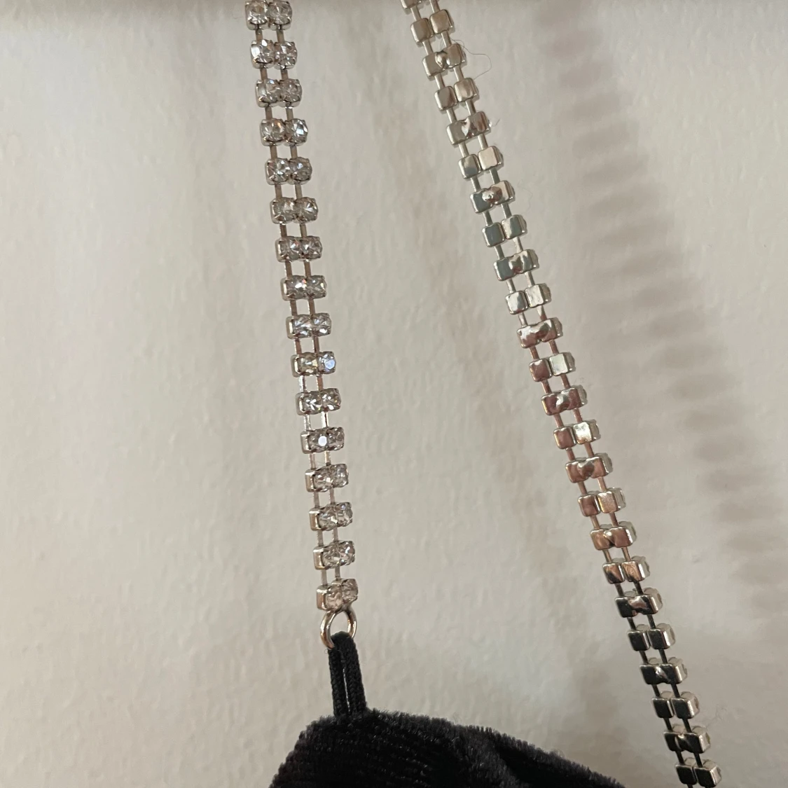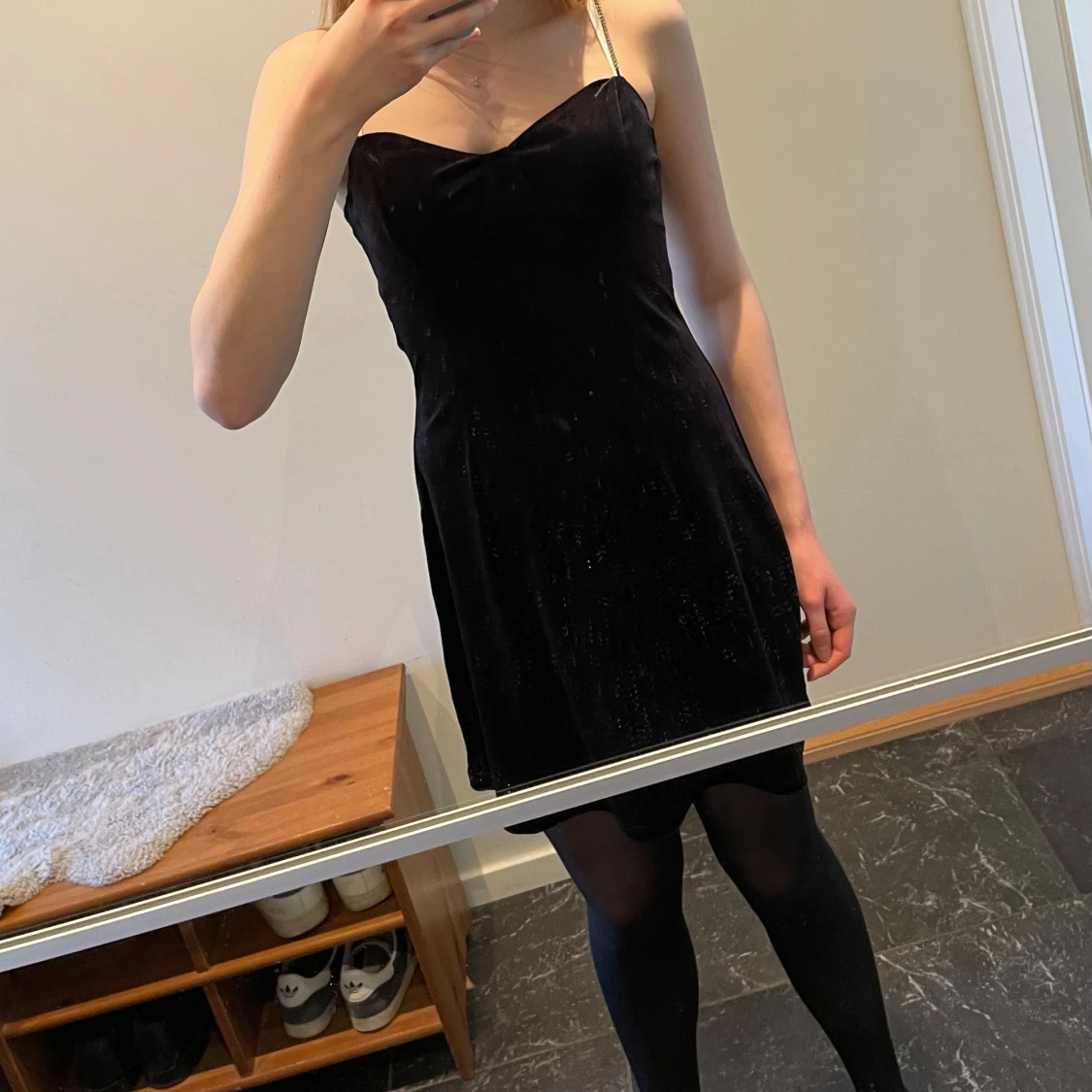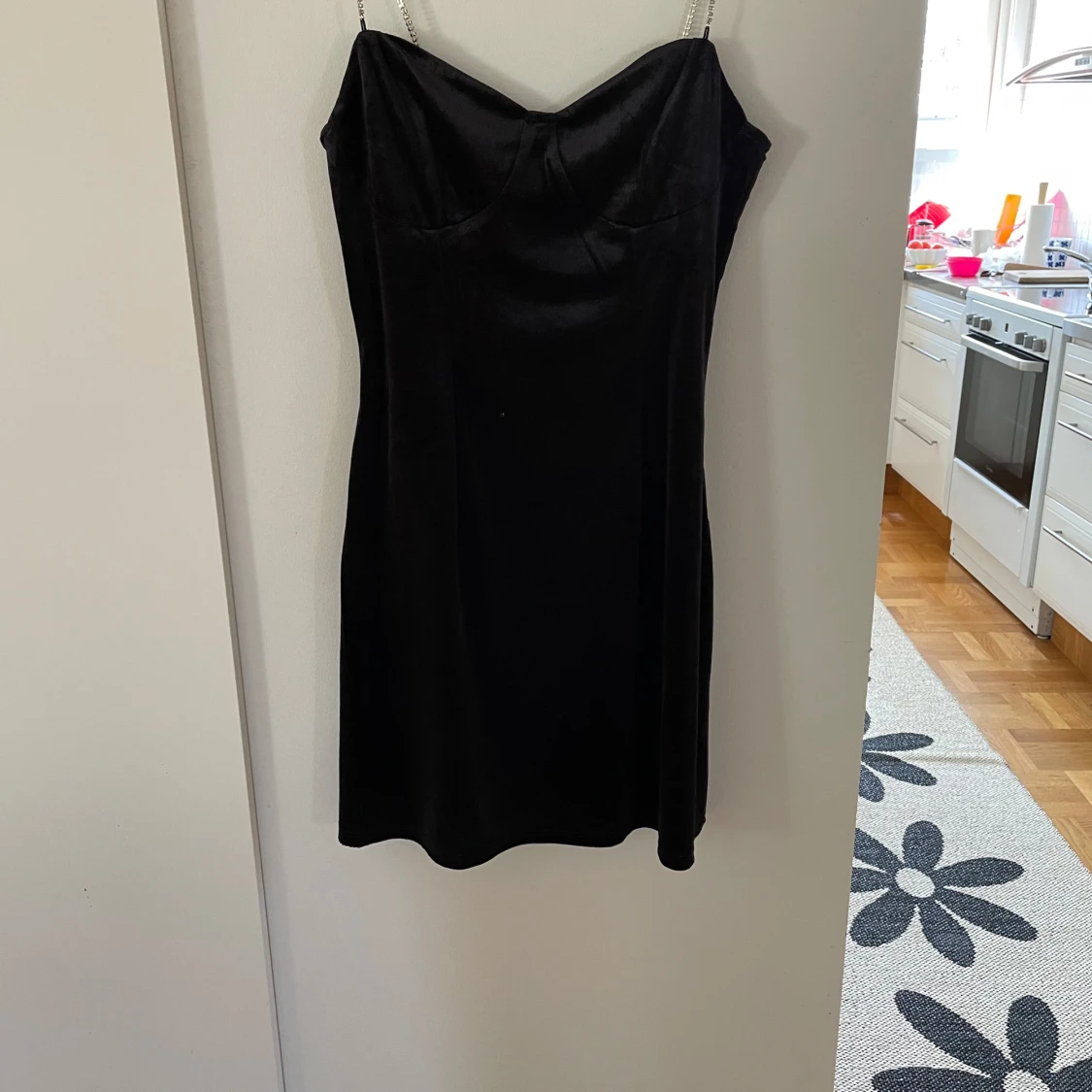 Snygg svart klänning från H&M med strassprydda axelband. Klänningen har en tight passform upptill men en står ut lite från midjan, den är kort men går ändå ner en bra bit över vaderna. Tyget är sammetsliknande. Perfekt för en kväll ute eller en fest!