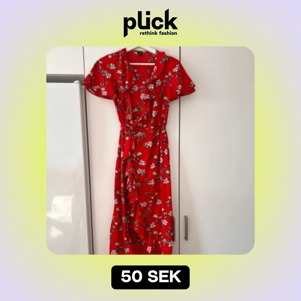 Blommig sommarklänning i omlottmodell med volanger och kort ärm.