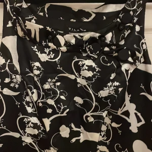 Snygg svart klänning från Vila med ett vitt blommönster. Klänningen har en elegant design med knappar vid halsen och är ärmlös. Perfekt för en stilfull look.