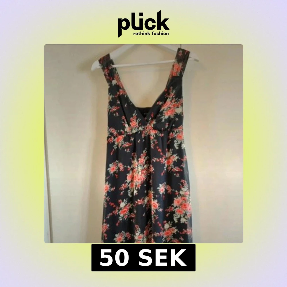 En klänning i fint skick. Klänningen har svart botten och blommor och blad går i rosa, röda och gröna nyanser. Modellen är kortare modell knälång cirka 100 cm lång. Klänningen har två lager ett tunt och skirt ytter tyg med blommorna och en fast skydd underklänning i svart, har även en liten dragkedja i sidan av klänningen, se bilder. INFO: Hund i hemmet.