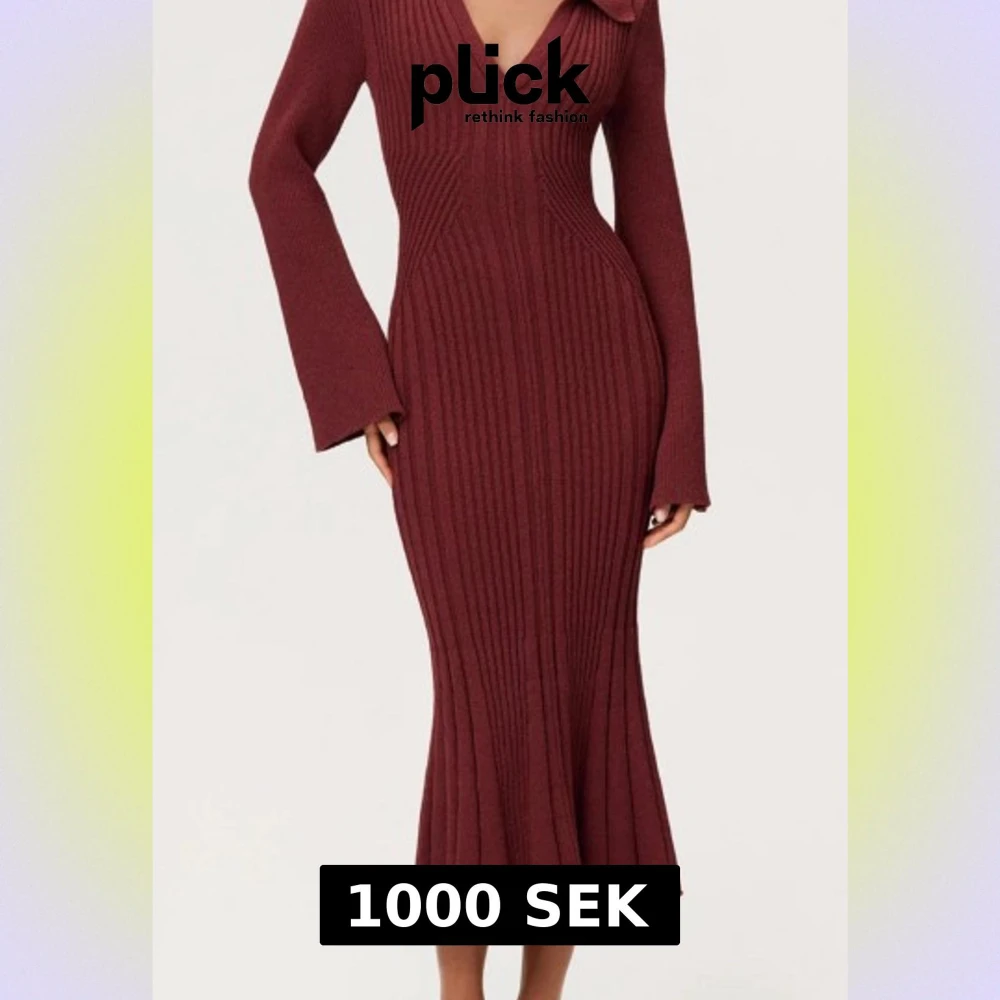 Säljer en vinröd långklänning från Adoore med ribbad struktur och v-ringad hals. Klänningen har långärmade ärmar med knappar vid ärmslut och en snygg krage. Materialet är stickat och klänningen har en figurnära passform som framhäver siluetten.