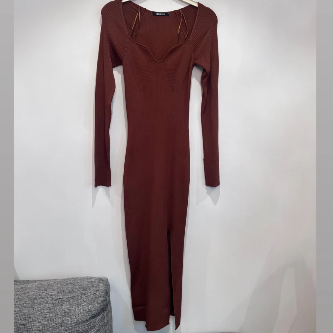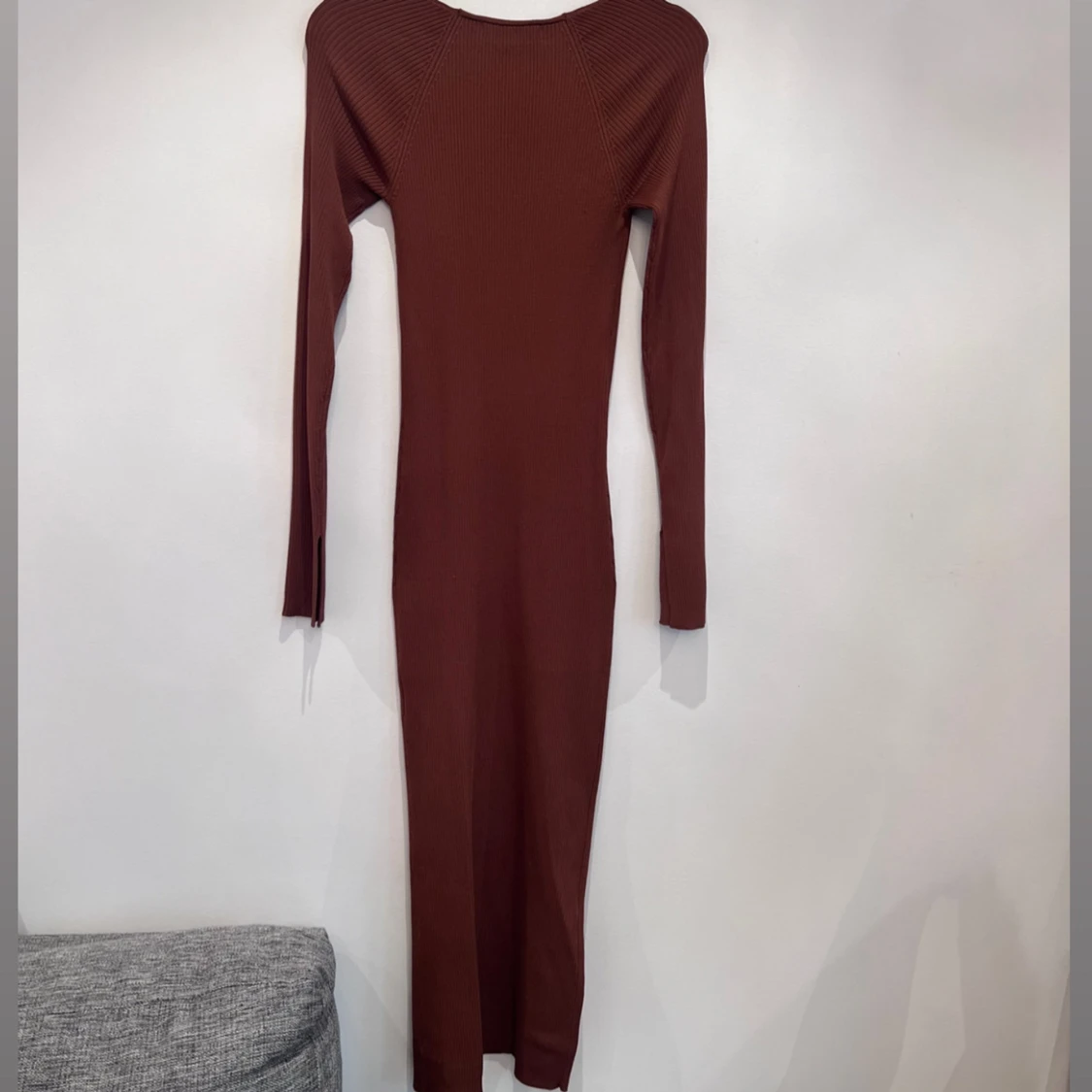 Fiona knitted dress. Stickad klänning med slits i sidan. Den har en midilängd, hjärtformad ringning, figurnära passform och långa ärmar med slits vid ärmsluten.