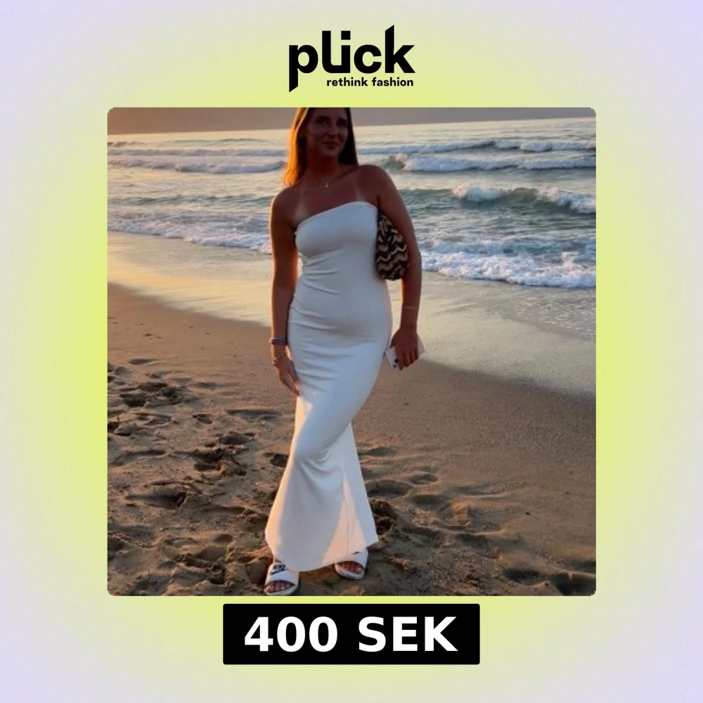 Supersnygg vit långklänning med axelbandslös design och figurnära passform. Perfekt för sommarkvällar på stranden eller när du vill känna dig extra chic. Enkel och stilren look som verkligen sticker ut.