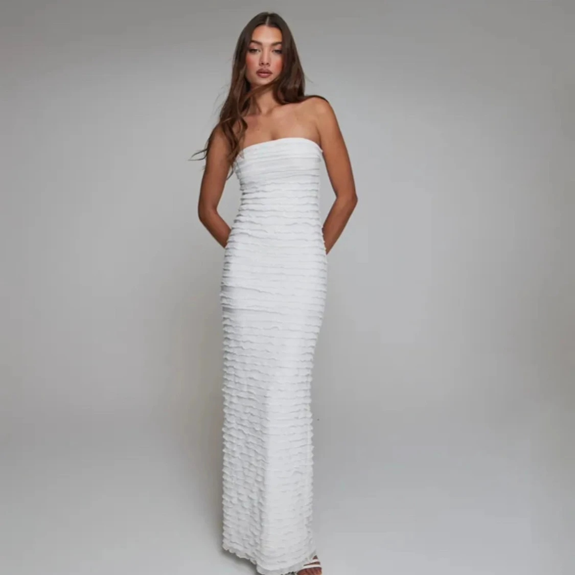 Säljer en elegant vit tublångklänning med strukturerad yta och figurnära passform. Perfekt för dig som vill sticka ut med en stilren och modern look. Klänningen har en rak siluett och är tillverkad i ett syntetmaterial. Perfekt för student/ball eller bara till vardags. Använd en gång och i NYSKICK