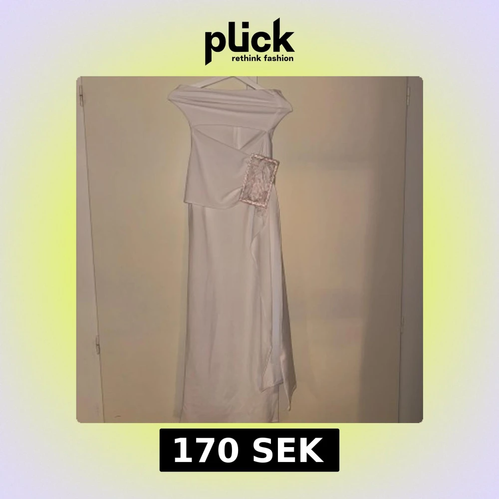 Elegant vit långklänning med axelbandslös design och asymmetriska detaljer. Klänningen har en stilren och modern look, perfekt för speciella tillfällen.