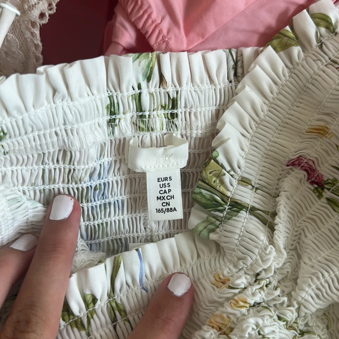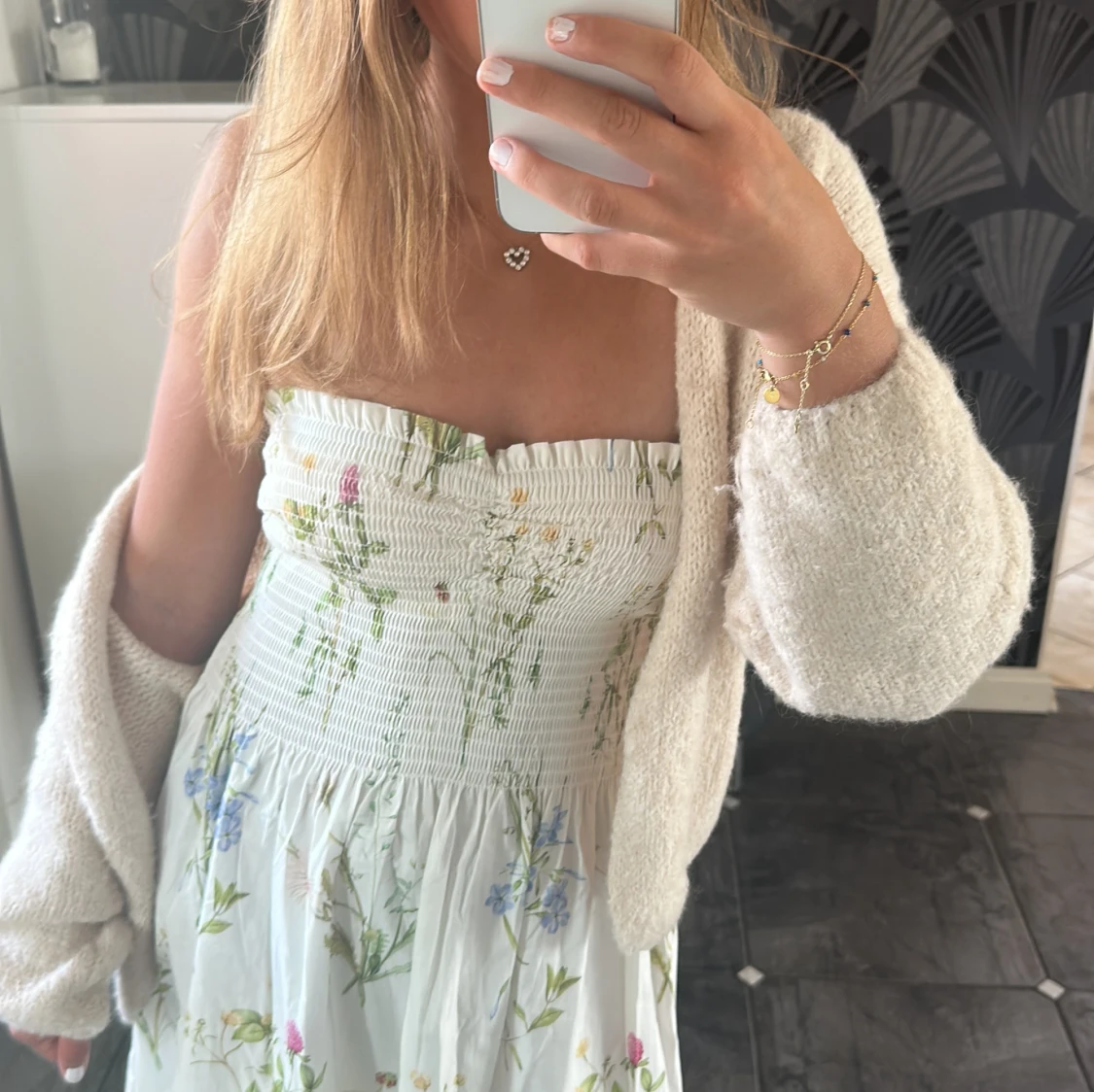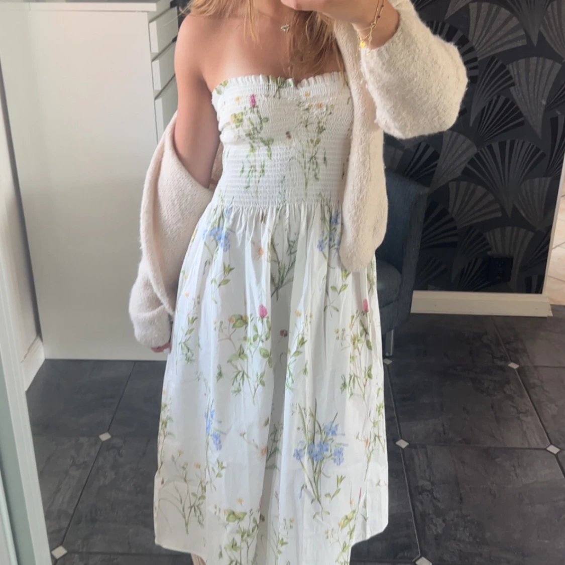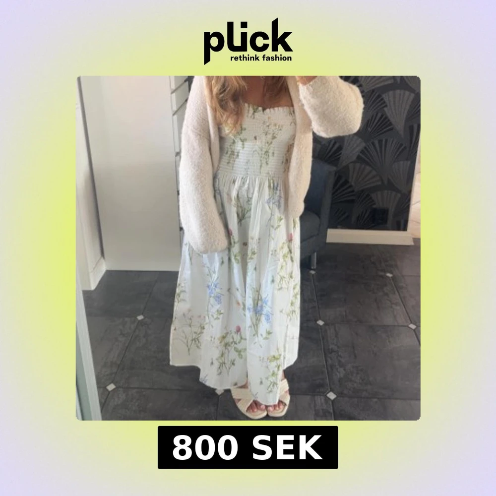 Superfin vit långklänning från H&M med smock upptill och blommigt mönster i storlek S 😊Det finns även band till som går att haka på men går lika bra att ha utan🥰Klänningen är oanvännd❣️
