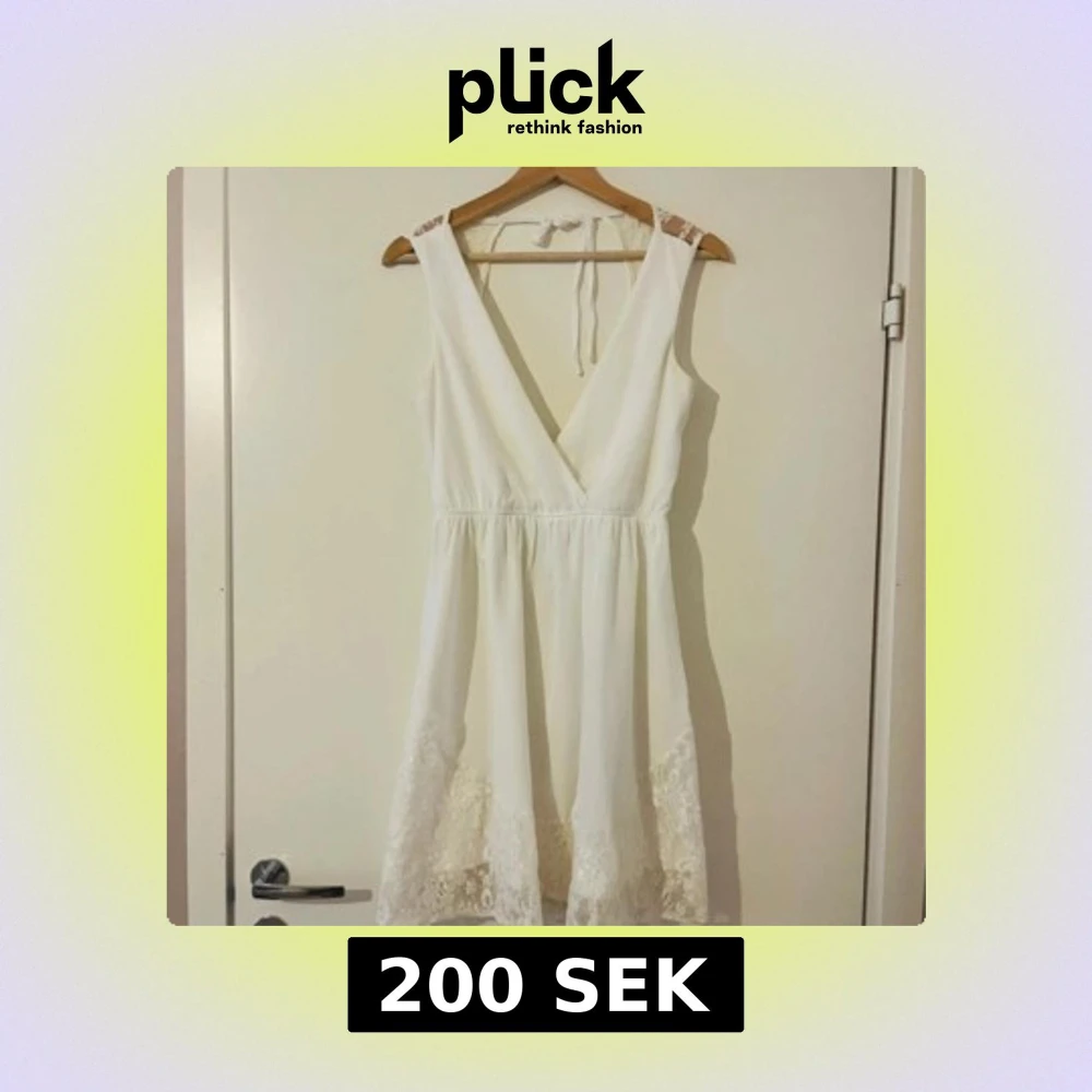 Superfin vit klänning med v-ringning samt öppen rygg. Klänningen har även spetsdetalher och knytband i nacken. Superfin till sommaren! Använd endast en gång.