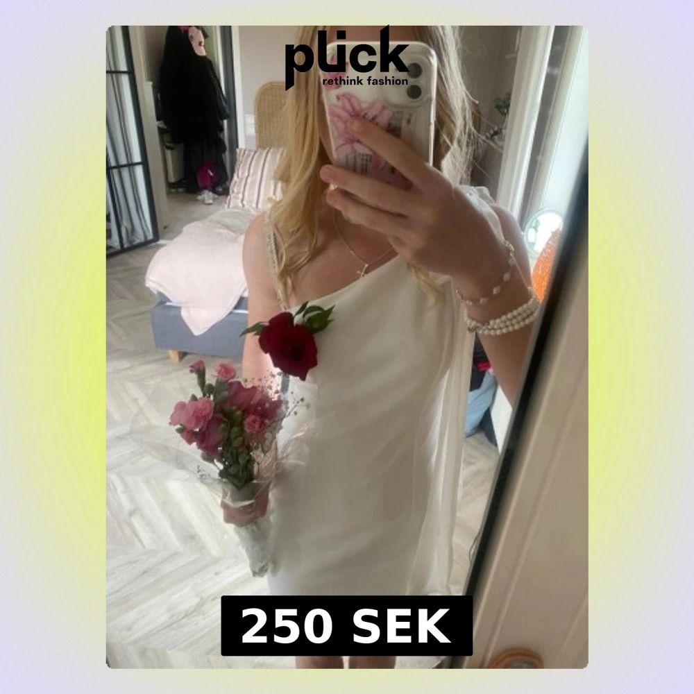 Vit klänning som är ganska kort, använd en gång under konfirmation och rosen på bilden var fastnålad och är inte kvar/ ingen del av klänningen. Den är one shoulder och har rosett över axeln💞 För mer bilder skriv privat ❤️Passar perfekt till student eller konfirmation.