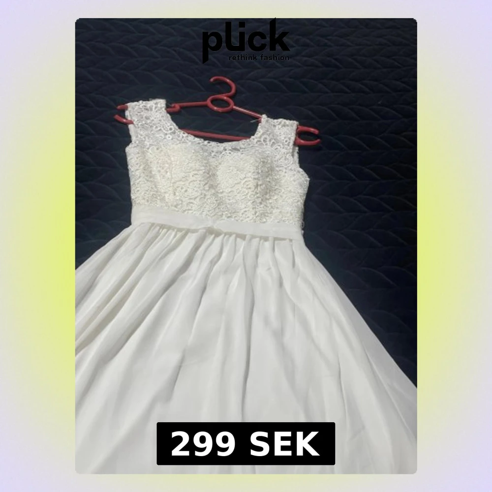 Elegant långklänning i vitt med spetsliv och v-ringad rygg. Överdelen har ett detaljerat blommigt spetsmönster och kjolen är i ett mjukt, flytande tyg. Klänningen är ärmlös och har ett markerat midjeband för en snygg siluett. den är bara använd en gång.