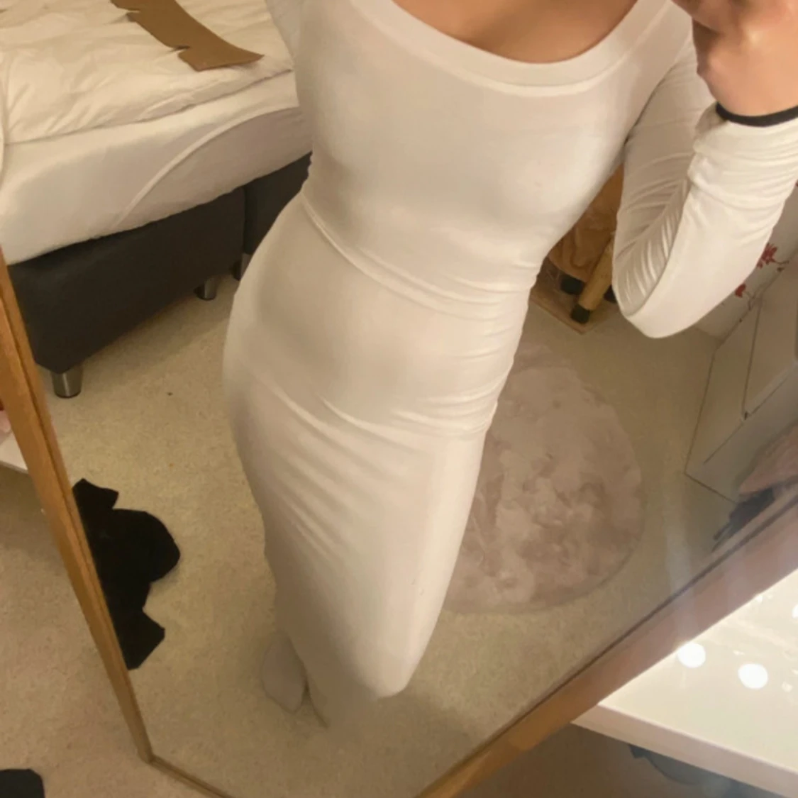 Säljer en stilren vit långklänning med lång ärm och rundad halsringning. Klänningen har en tight passform som framhäver figuren och är gjord i ett mjukt, stretchigt material som känns skönt mot huden. Perfekt för dig som gillar minimalistisk och clean stil.