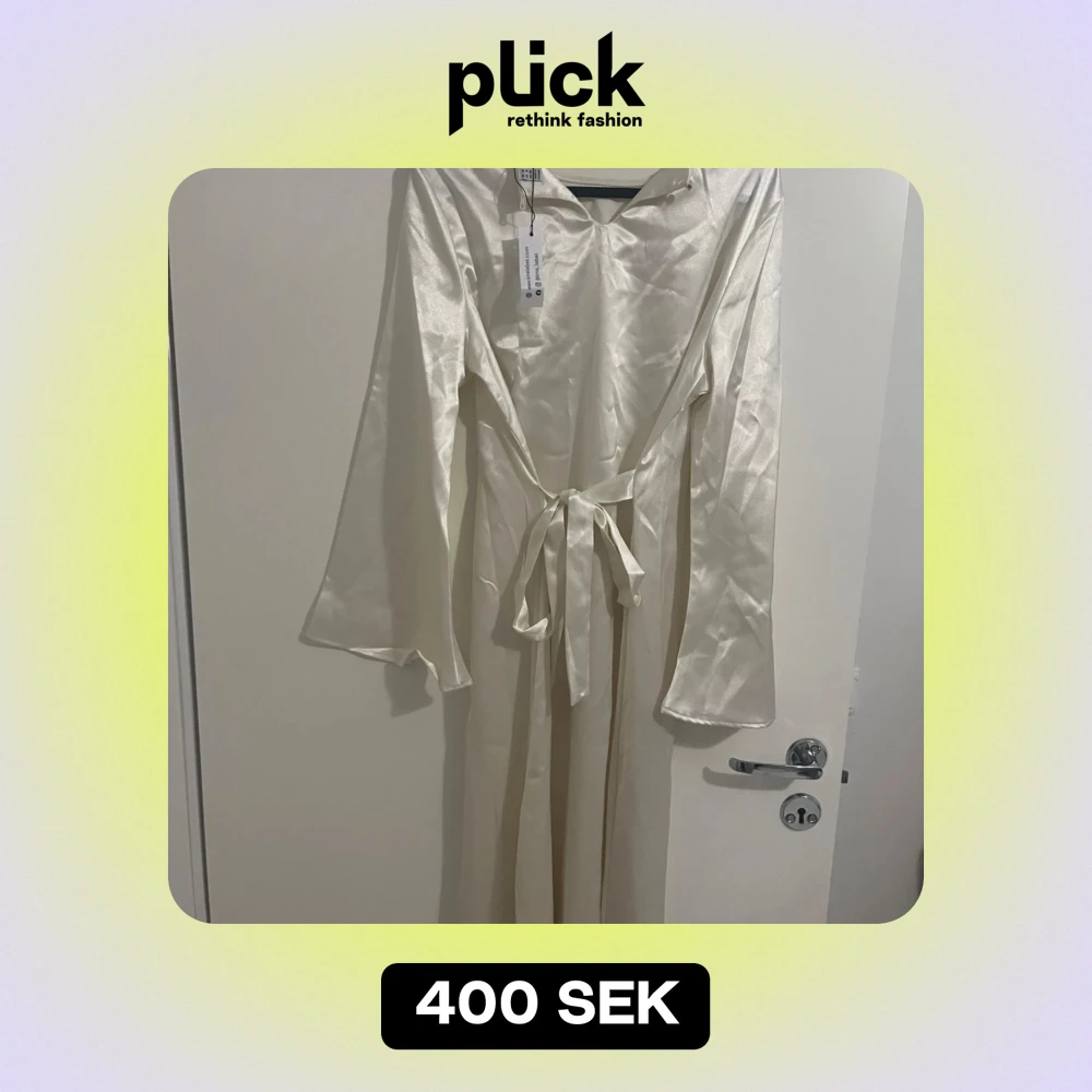 Elegant champagnefärgad långklänning i satin med långa ärmar och ett knytband i midjan. Perfekt för festliga tillfällen eller en lyxig kväll. Klänningen har en enkel och stilren design som ger en sofistikerad look.
