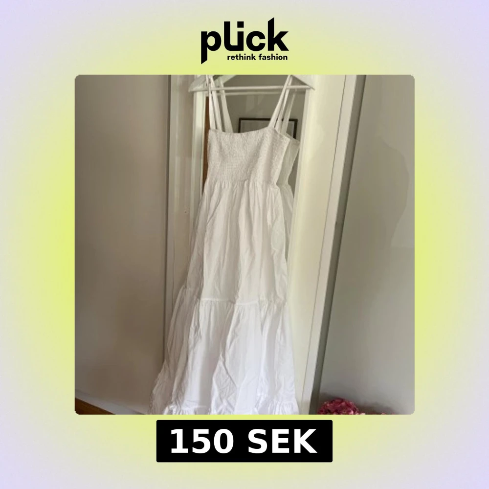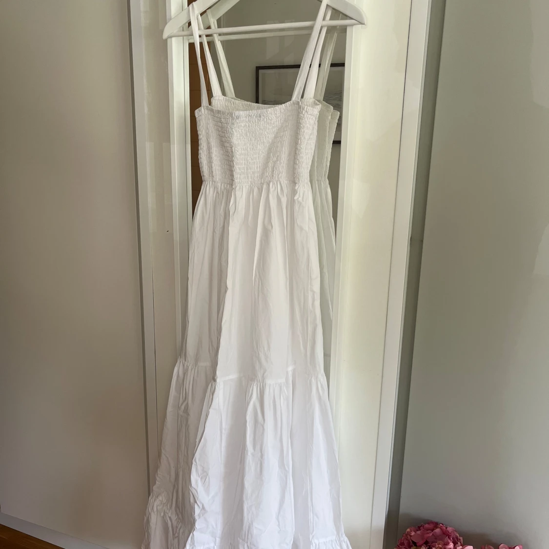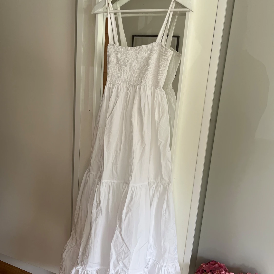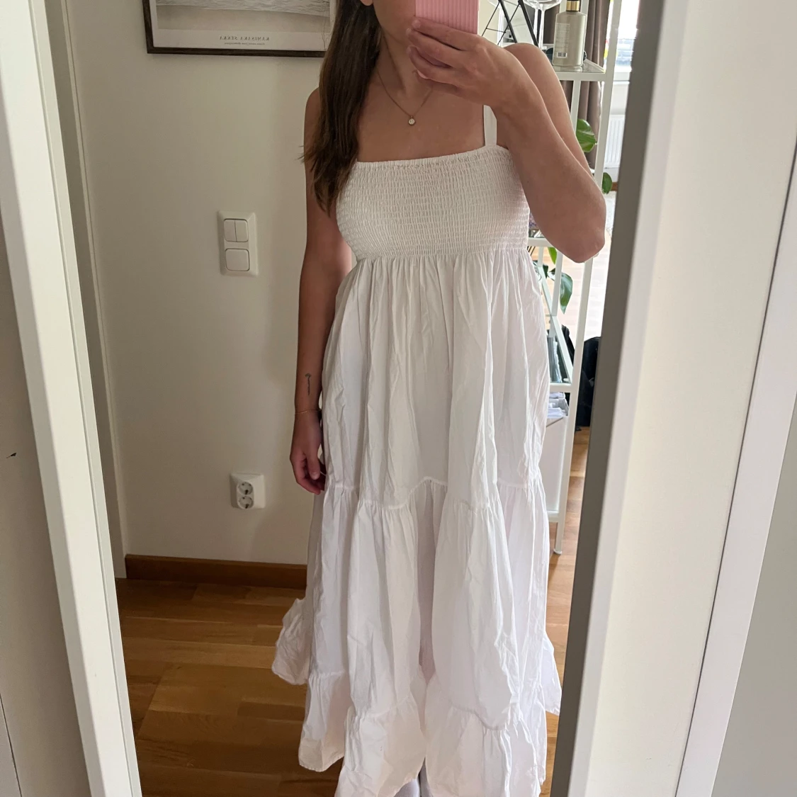 Superfin vit långklänning med smockat liv och breda axelband. Klänningen har volanger nertill. Från ZARA, storlek M. Aldrig använd själv men köpt begagnad. Mycket fint skick, inga fläckar eller andra tecken på användning!