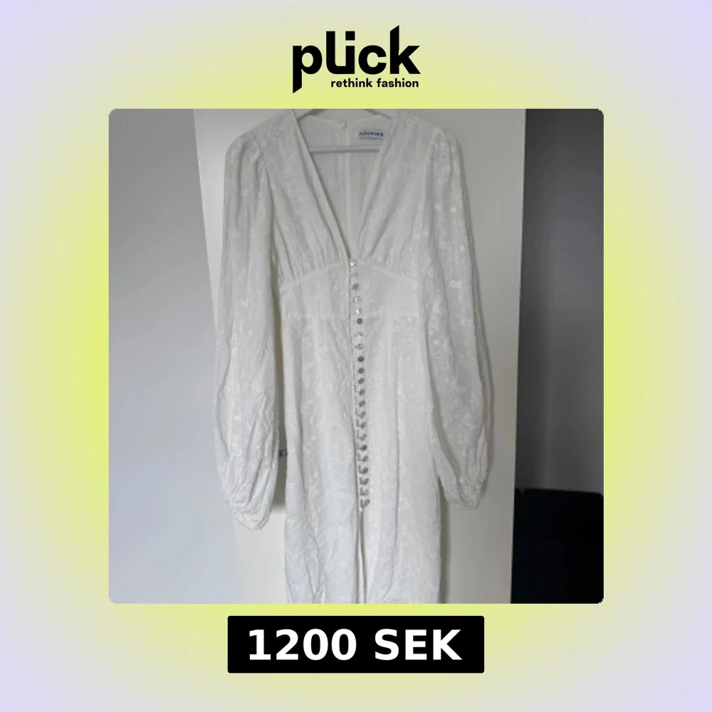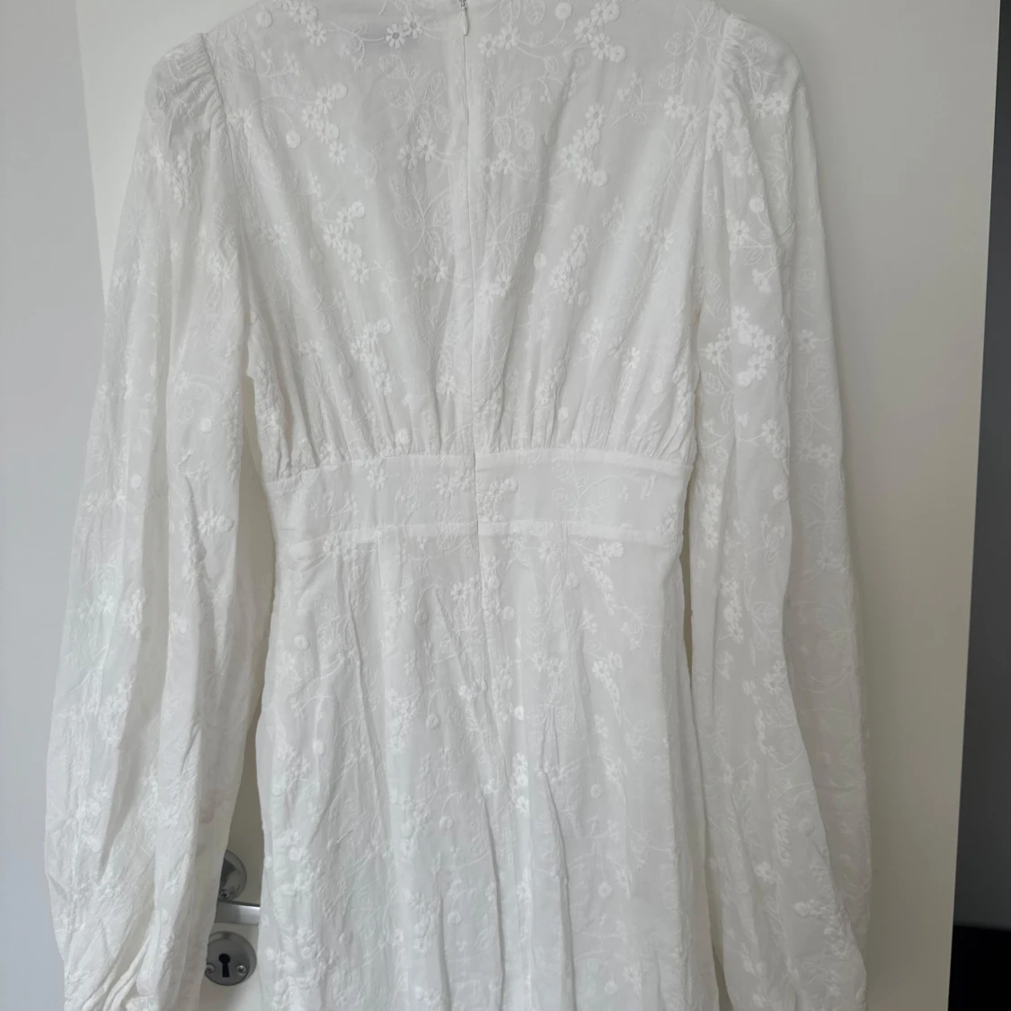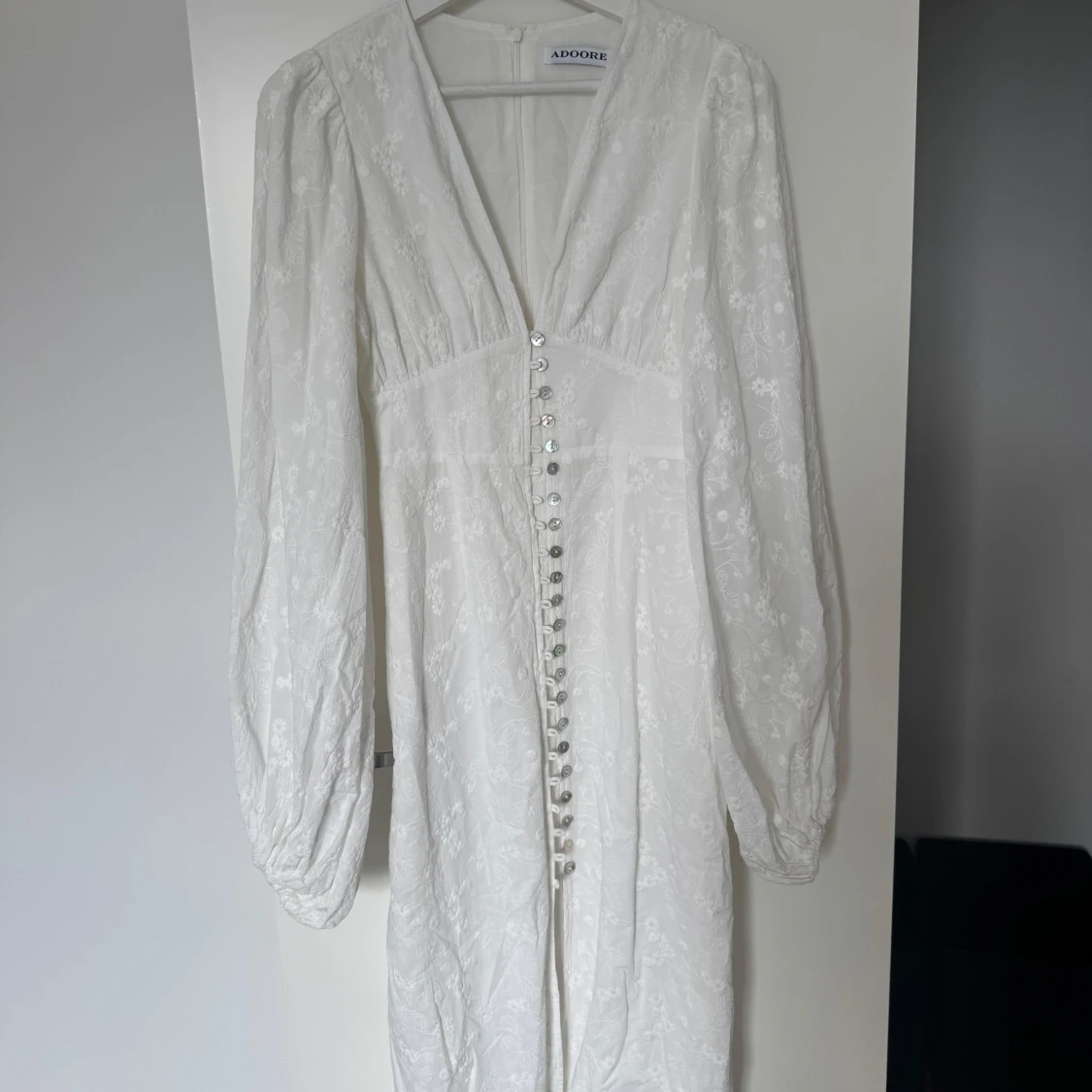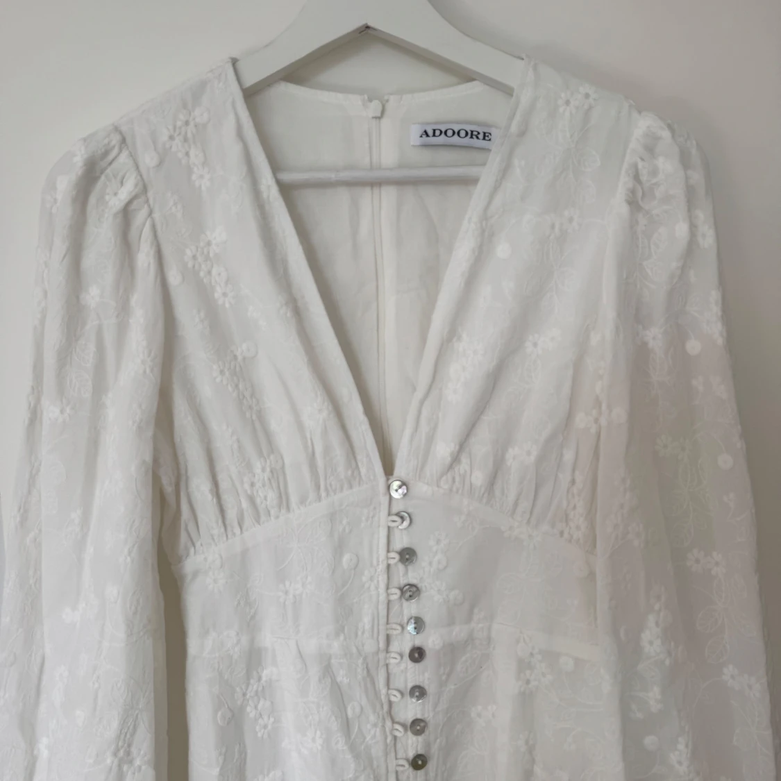Vit långklänning från Adoore med broderade blommor, v-ringning och långa puffärmar. Klänningen har dekorativa knappar framtill och är tillverkad i ett lätt, broderat tyg som ger en lyxig känsla. Nyskick!
