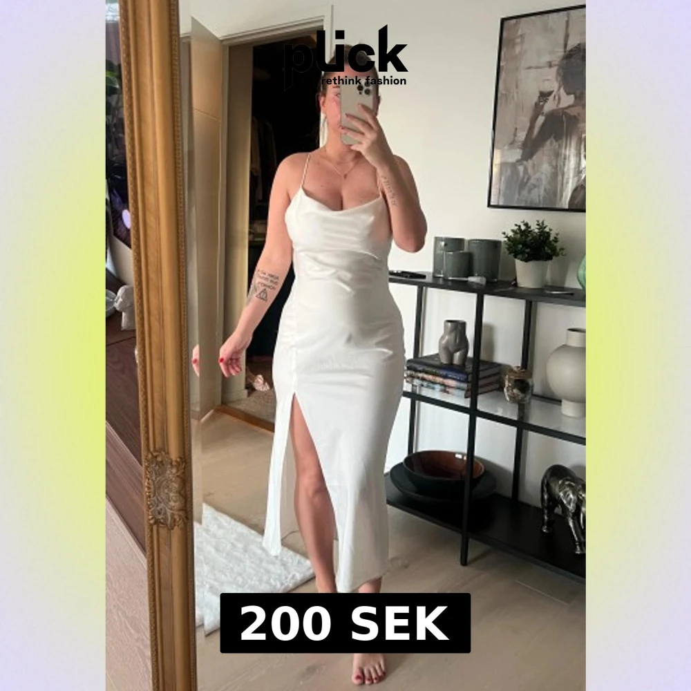Säljer en elegant vit långklänning med smala axelband som korsas i ryggen. Klänningen har en snygg slits framtill och är gjord i ett glansigt satinliknande material. Perfekt för dig som vill ha en stilren och trendig look.