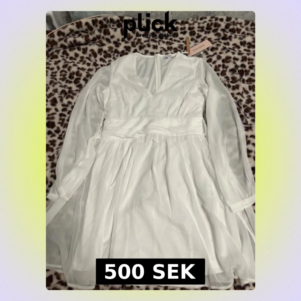 Superfin vit kortklänning från Bubbleroom med v-ringning, långa transparenta ärmar och knytband i midjan. Helt oanvänd. Klänningen har ett flowy fall och markerad midja, perfekt för dig som gillar en romantisk och stilren look.