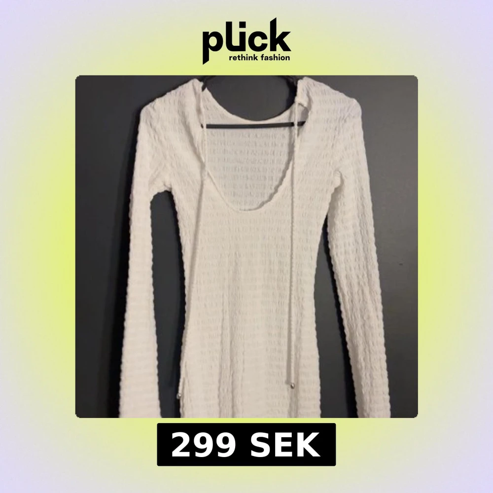 Säljer en stilren vit ribbad klänning med långärmad design. Klänningen har en djup v-ringning och snörning framtill.