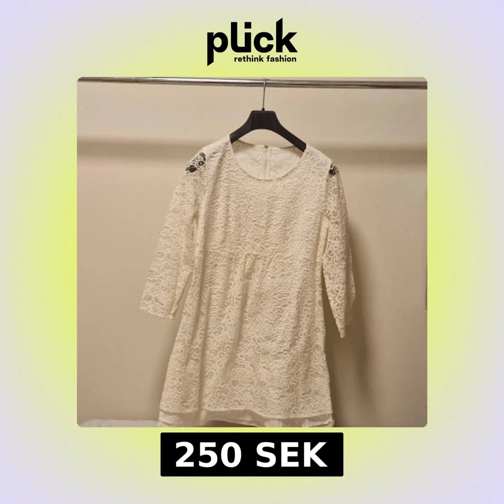 Charmig vit spetsklänning med trekvartsärm och ett vackert blommönster 🌸🌸 Den har dragkredja där bak. Lappen är borta så vet inte storlek men skulle säga s. Perfekt för vår och sommar eller som studentklänning! 🍾 Bara att skriva om ni har frågor 💗