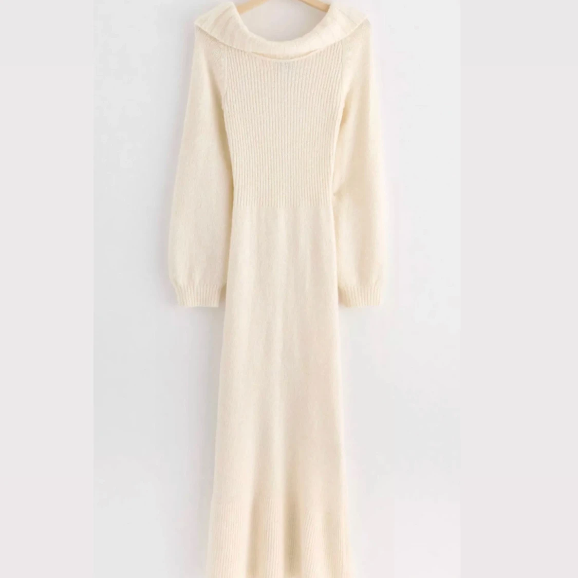 Säljer en vit stickad långklänning från Lindex. Klänningen har en ribbad design och är off shoulders. Har använt klänningen en gång och säljer den för att den inte kommit till anständning igen. 💕