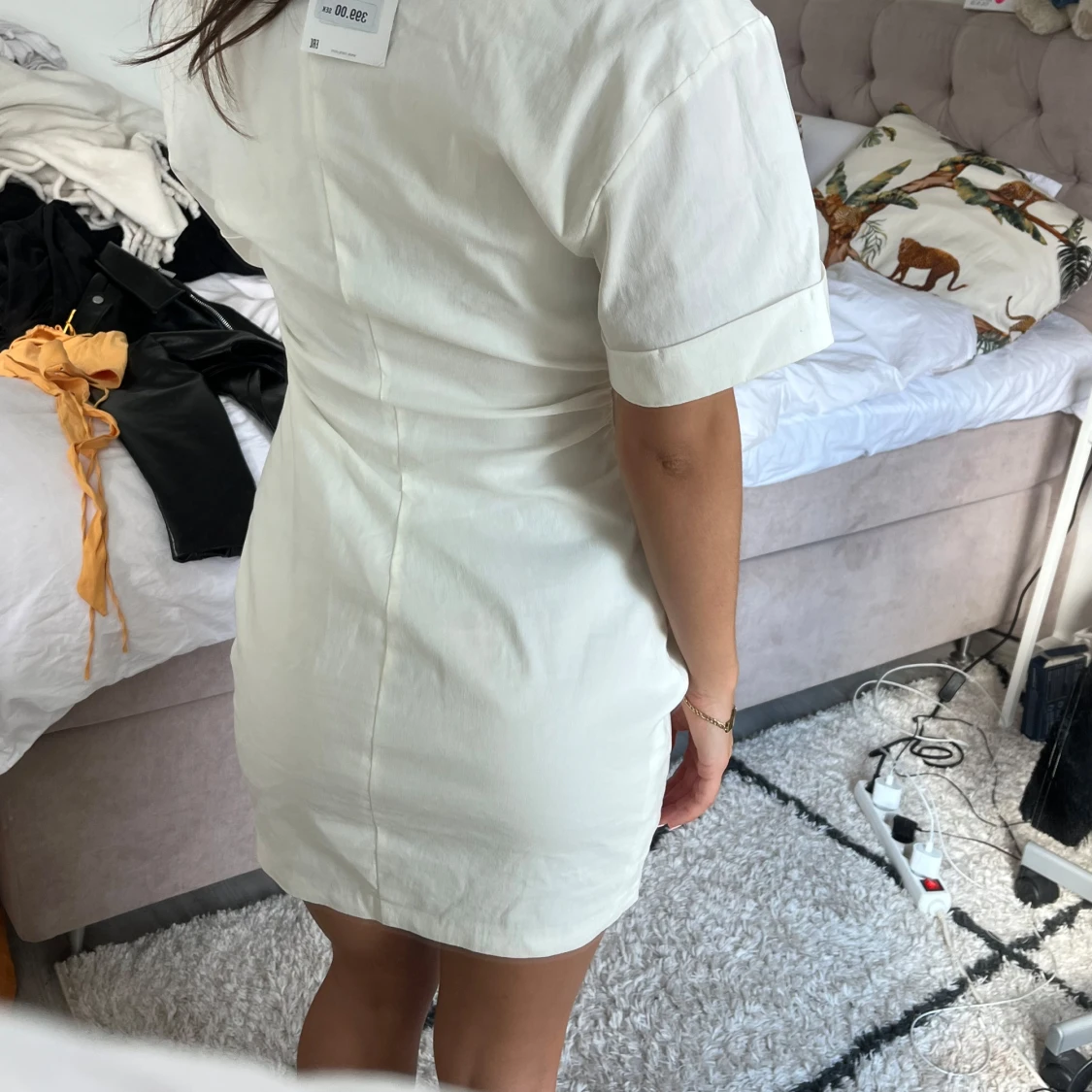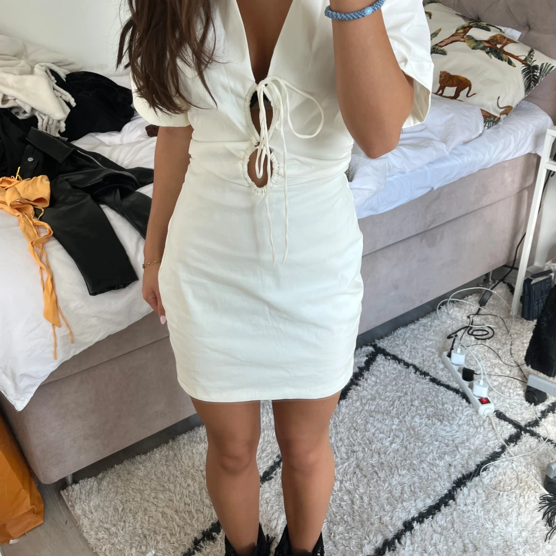 Superfin vit kort klänning med v-ringning och snygg snörningsdetalj framtill. Prislapp kvar: nypris 399. Perfekt för sommarens alla tillfällen!