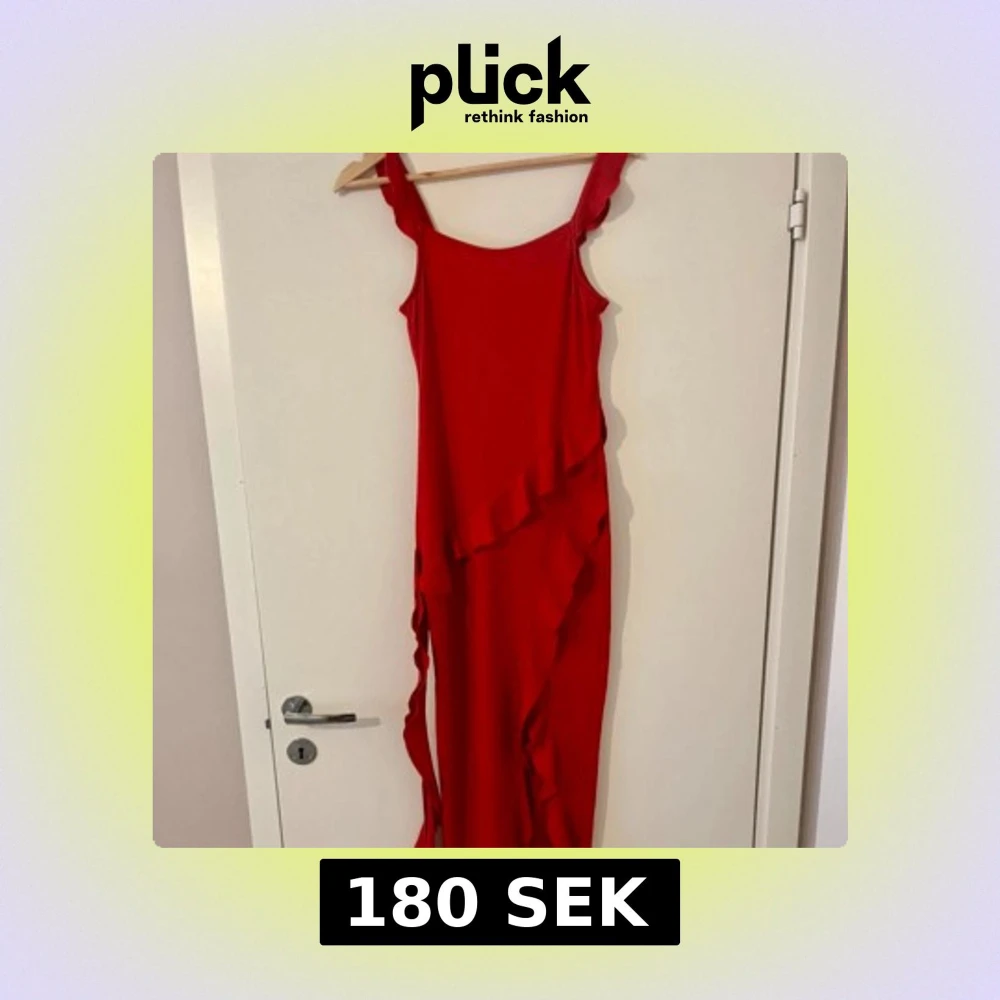 Säljer en röd långklänning med volangdeltaljer och slits. Superfin och smickrande på. Helt ny!