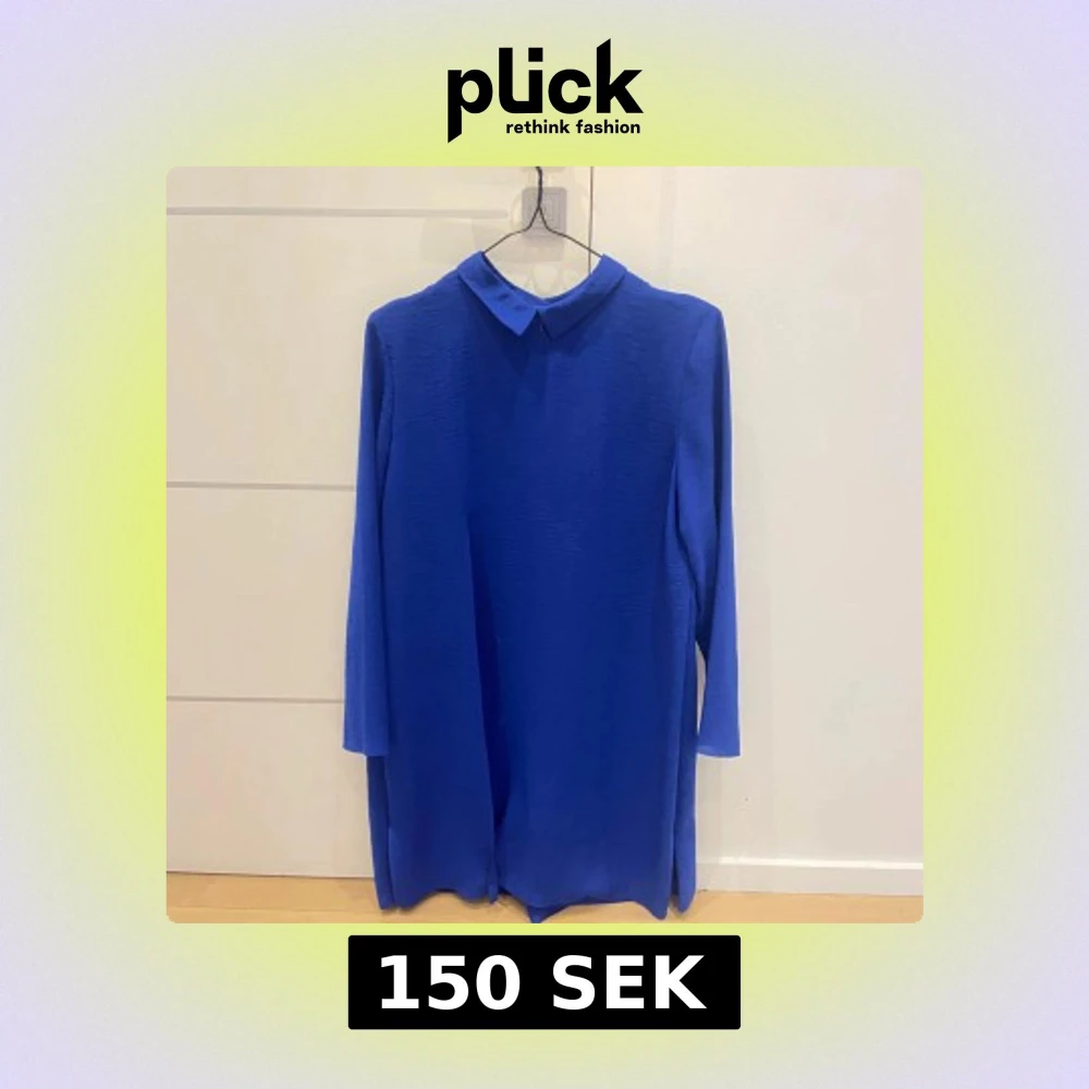 Säljer en kornblå klänning med klassisk krage och långa ärmar. Klänningen har en rak passform och stängs med dragkedja i ryggen. Perfekt för dig som gillar stilrena och enkla plagg med en poppig färg.