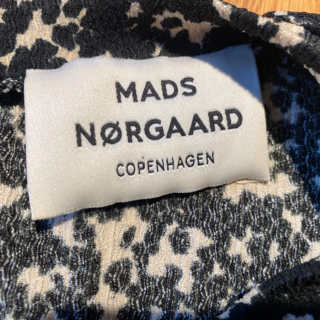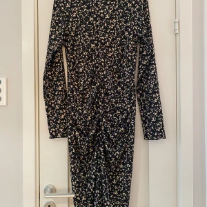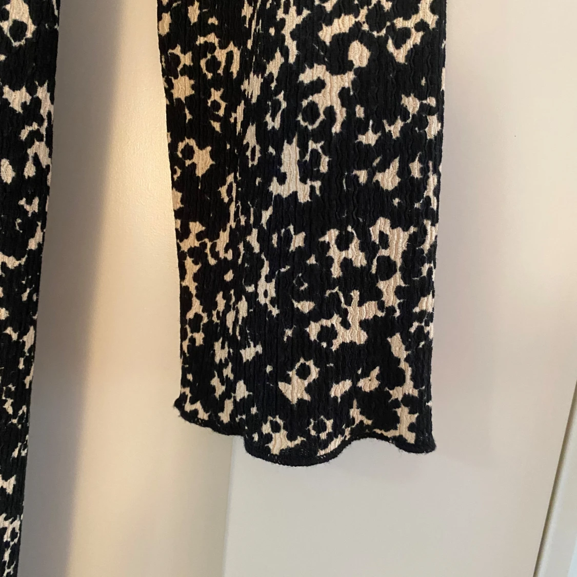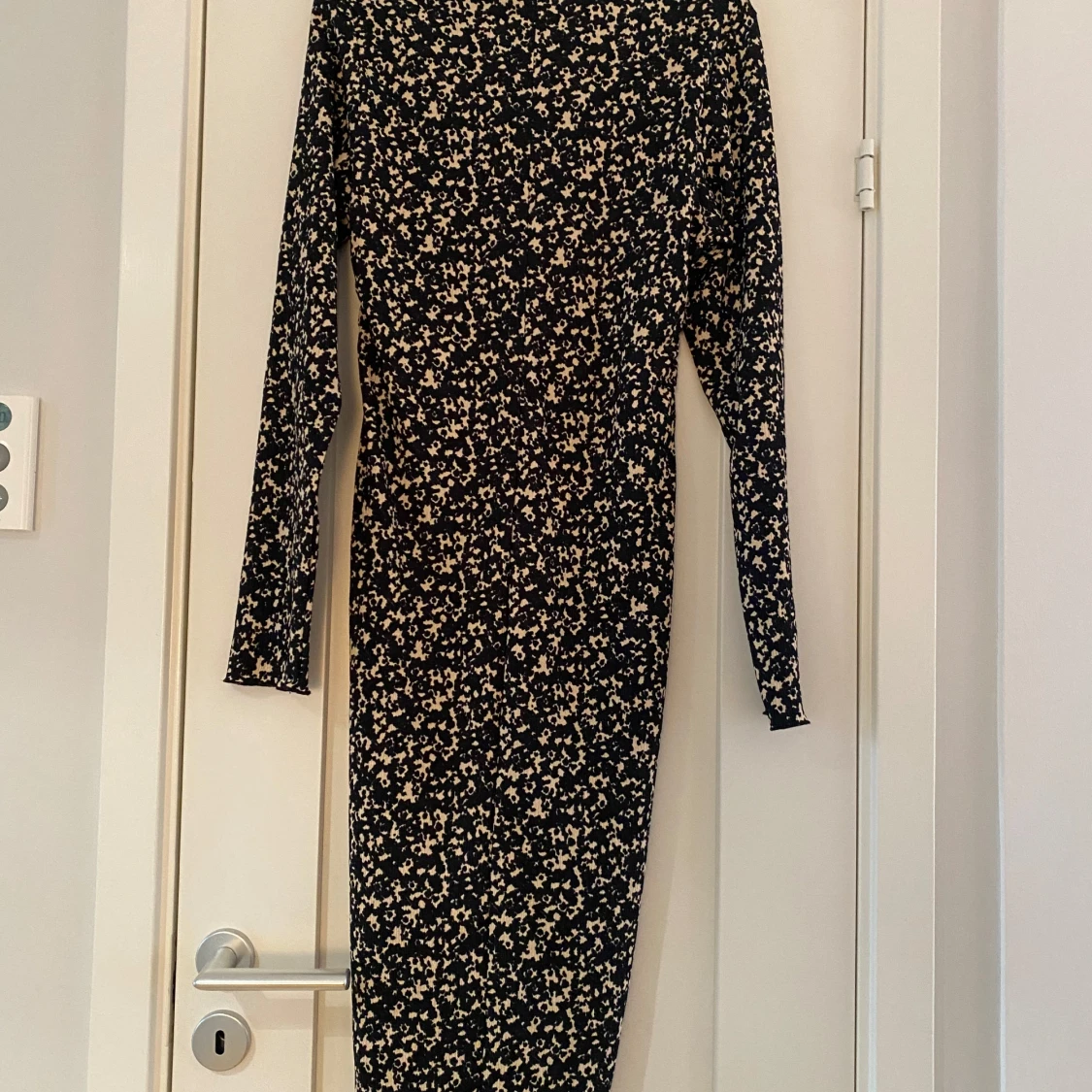 Snygg svart klänning med ett mönster i beige. Klänningen har en lång passform och långa ärmar, perfekt för en stilren look. Materialet ser ut att vara mjukt och bekvämt, vilket gör den idealisk för både vardag och speciella tillfällen. Ny beige och svart mönstrad klänning i strl XL från Mads Norgaard, modell Dimma dress. Ny, aldrig använd. Klänningen har resår framtill och dragkedja där bak. Kvalitet Pollux. Över bröstet: ca 47 cm Längd från axeln och ner: ca 116 cm 98% polyester, 2% elasta