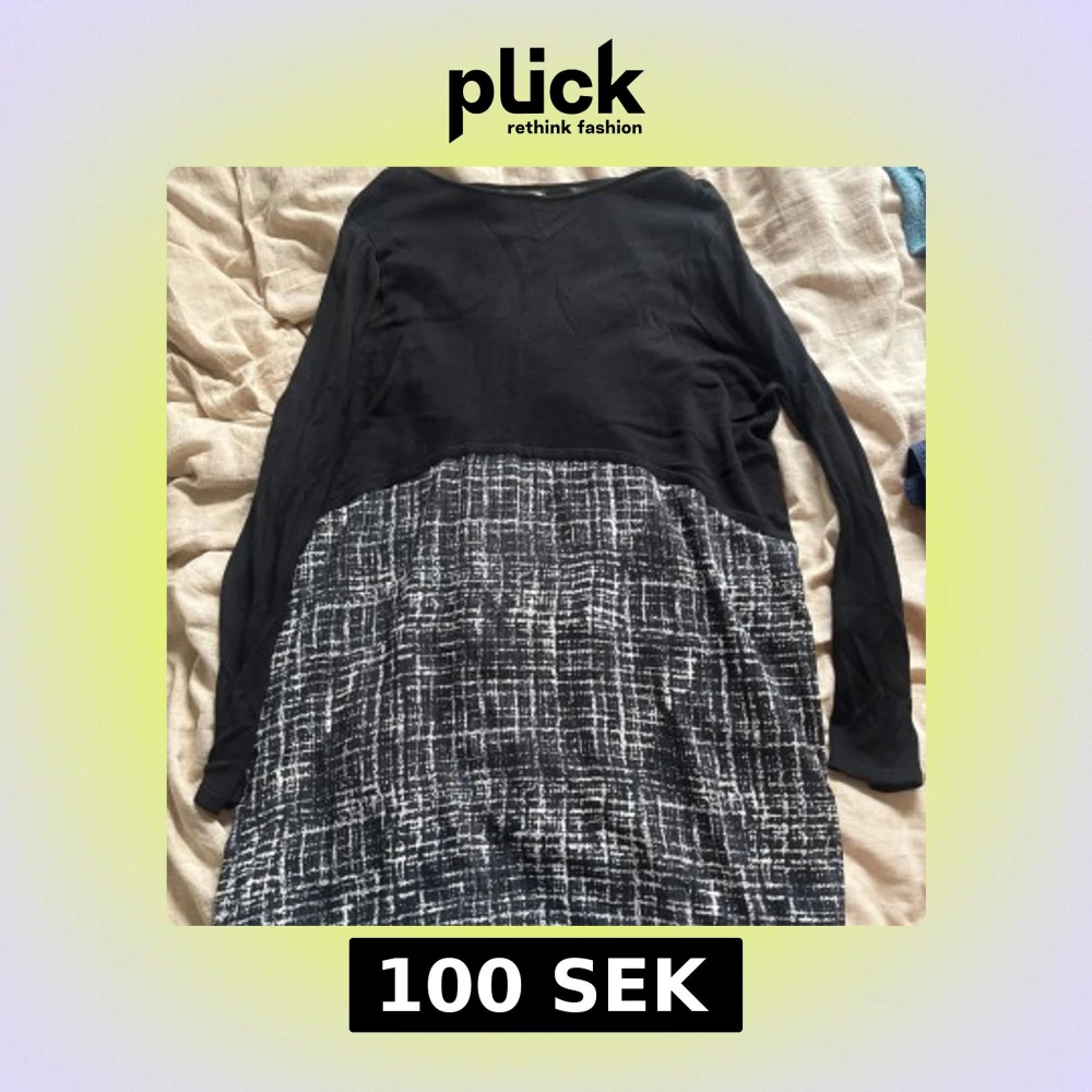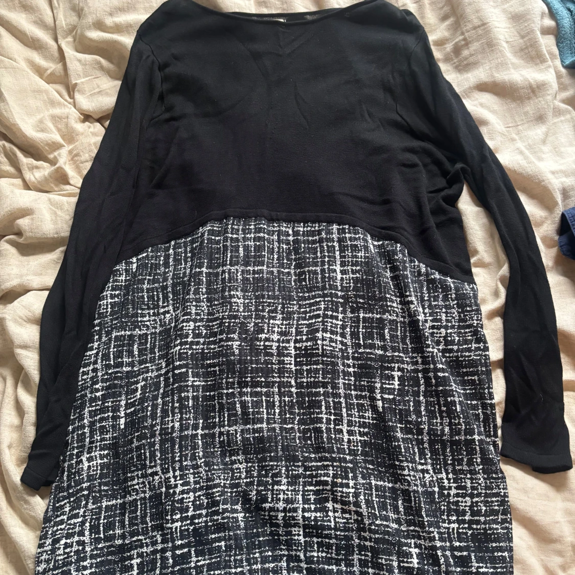 Snygg svart långärmad klänning från Isay med coolt rutigt mönster i vitt på nederdelen. Överdelen är helsvart och har en enkel, stilren design. Perfekt för dig som gillar en modern och avslappnad look.