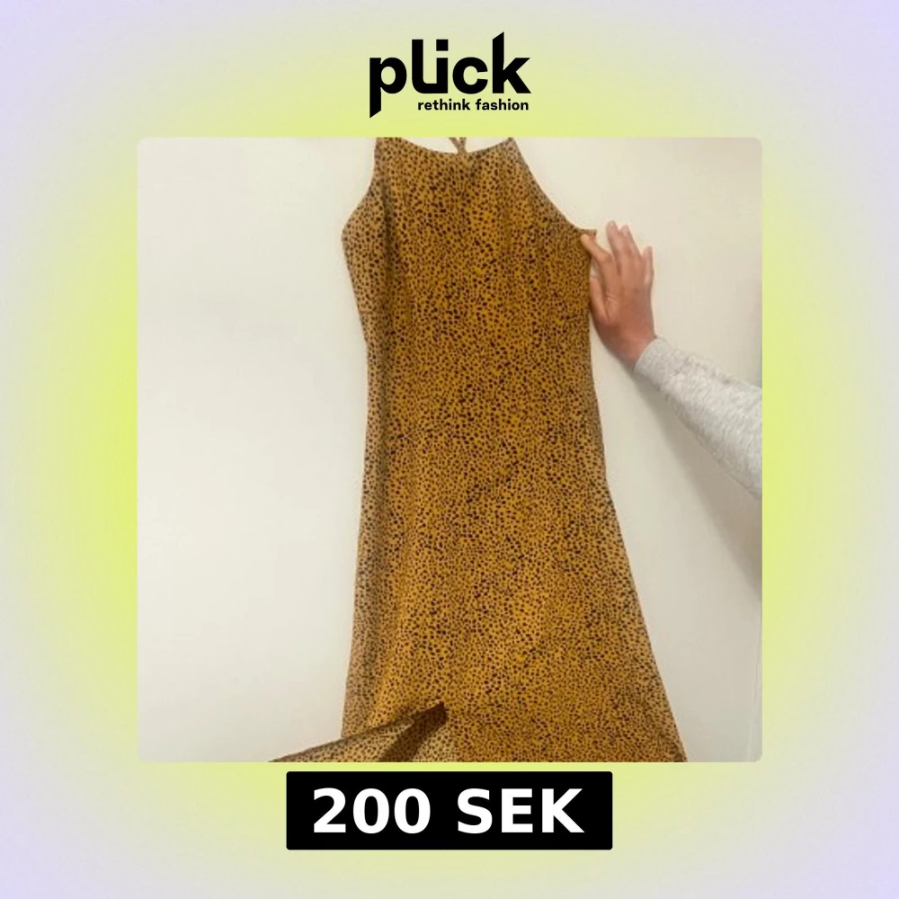 Säljer en snygg långklänning i gul med svart leopardmönster. Den är rygglös med ”snören” i kors. Den är ganska lång med slits lite över knät. Knappt använd