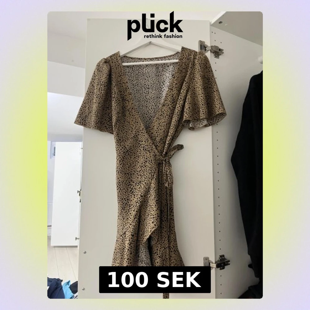 Snygg kort omlottklänning i beige med svart prickigt mönster. Klänningen har v-ringning, volangkant nedtill och knyt i midjan. De korta ärmarna är luftiga och ger en avslappnad vibe. Perfekt för dig som gillar trendiga detaljer och mönster.