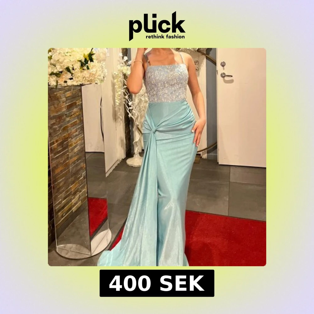 Säljer en elegant ljusblå långklänning med glittrig, broderad topp och smala axelband. Kjolen har en snygg rosettdetalj i midjan och ett lätt glansigt material som ger en lyxig känsla. Perfekt för bal eller fest!